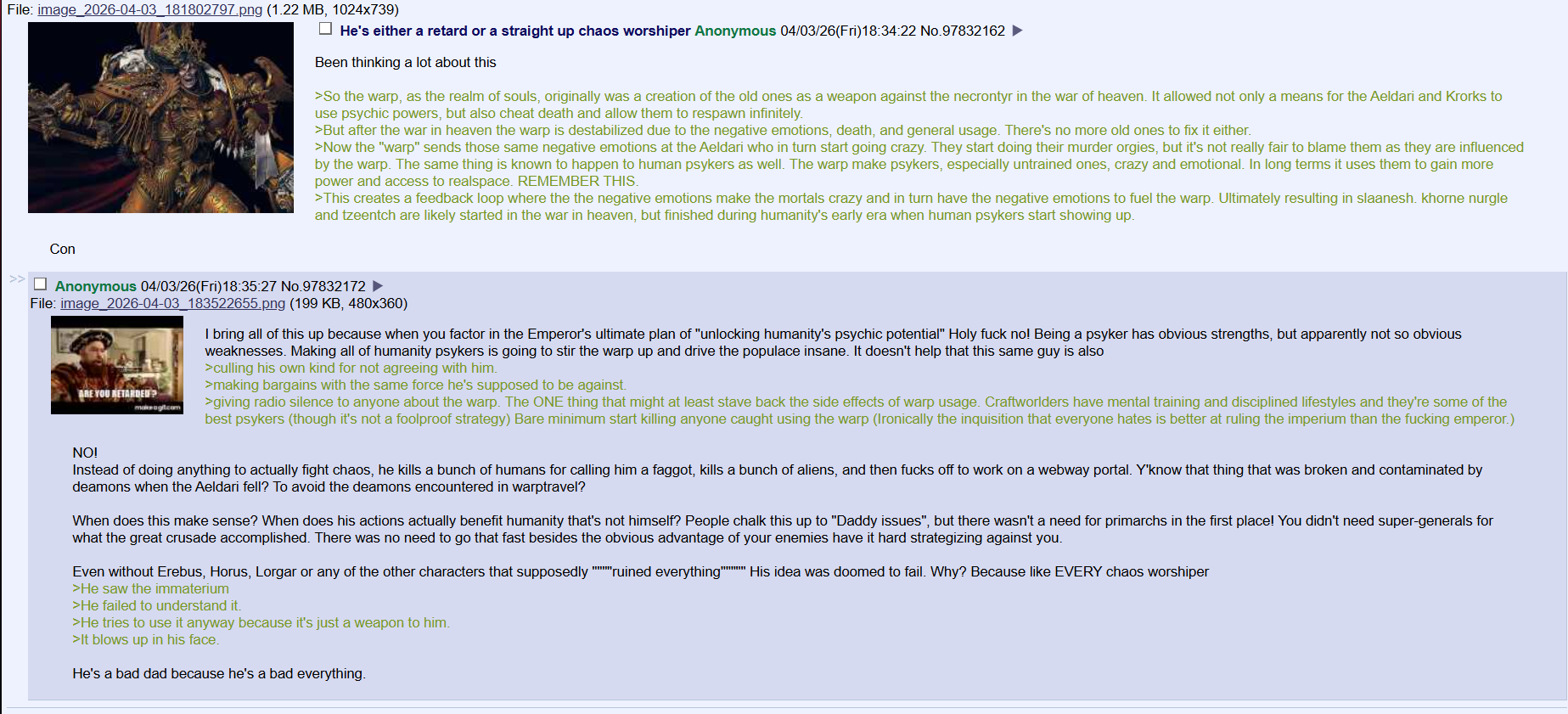 >>97831943>Worse than that he was absolutely horrible at his job. The average dipshit anon could do a better job than the Emperor, granted the same powers.Anon, the Emperor is a gigantic basement dweller nerd who explicitly hates the warlord persona, he does it because when Malcador found him living in a cave basement during the Age of Strife (working on unfucking humanity's genome) it was Malcador who convinced him he would need to be a warlord and emperor to unite Terra.