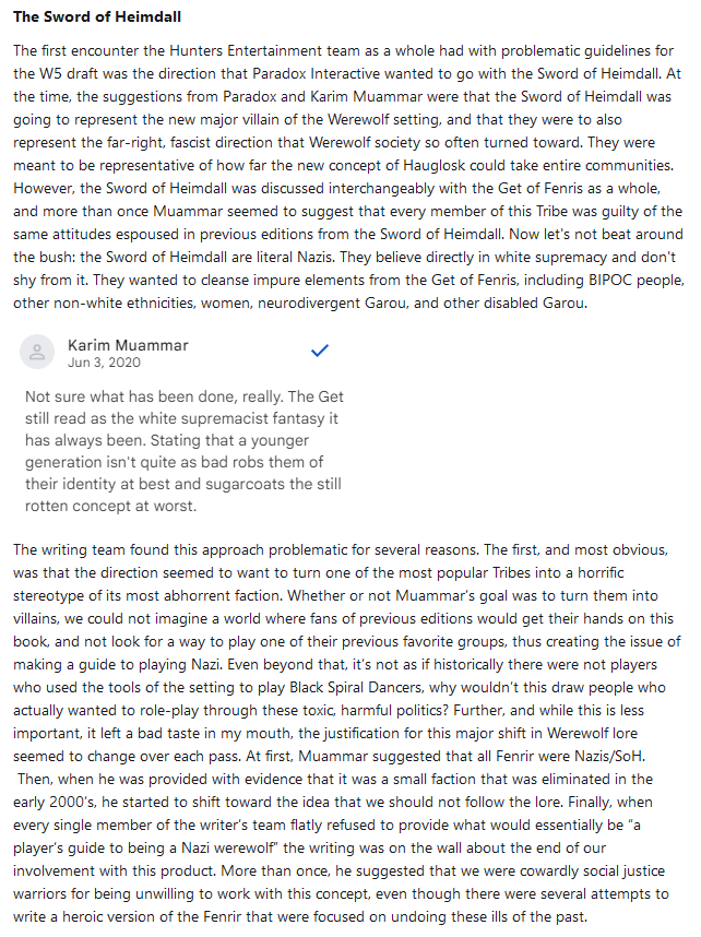 >>97709414It boils down to the fact that Karim Muammar is a liberal Swedish guy who sees this ahistorical fetishisation of the Norse as a white supremacist power fantasy. Unlike the example you gave in >>97709444, there's actual evidence of white supremacists fetishising Norse culture in order to promote their political, and he incorrectly assumed that the Get of Fenris were another example of this.So, Karim was strongly motivated to demonise, vilify and annihilate any positive trait that the Get of Fenris had. He wanted to turn the entire tribe into dumb white supremacists who the players have to kill and insisted that any other interpretation would either be removing what he saw as their core identity as racists, or allowing players to revel in what he saw as a racist fantasy.Karim Muammar was incapable of seeing the Get of Fenris as anything other than a racist power fantasy because according to his personal politics, anything that fetishises or celebrates old Norse culture was a dog whistle for white supremacy in his mind.And as the guy in charge of the World of Darkness at the time, he had the final say. He was so adamant in this belief that he dropped an entire team working on W5 and scrapped most of their work because they refused to kowtow to his whims.