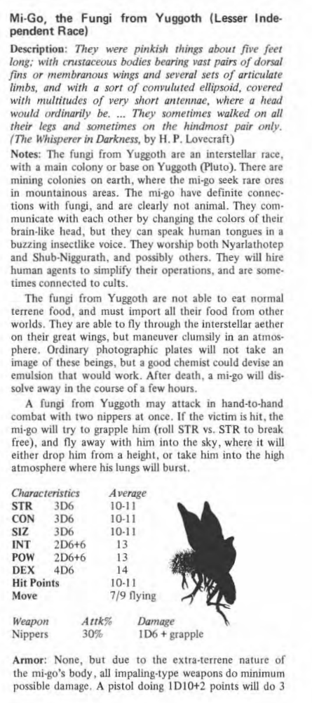 >>97835742Geez, fair enough. Though I would still say that as long as you make Mi-Go No. 4 the one the players investigate on their own, the frost weapon plan is still good. No. 4 only has 8 hit points, meaning even with the three points of armor and impaling weapons reduction, it's not hard to have the players beat it to death with melee weapons. Definitely not easy, they'll only have a round or two to do it and need to succeed a lot, but still viable.But like I said, old CoC adventures tend to have a lot of issues because the writers really didn't understand the intricacies of writing investigative horror at the time.