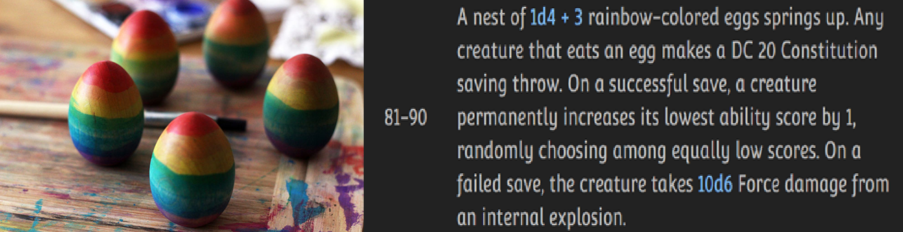 >>97176049>How many eggs could your character (or last character you got to play) fit in their mouth? is it at least 5?My last group had started eating the Rainbow Eggs from a Bag of Beans. IIRC one dude ate like 4 at once and got a +4 to his stats!