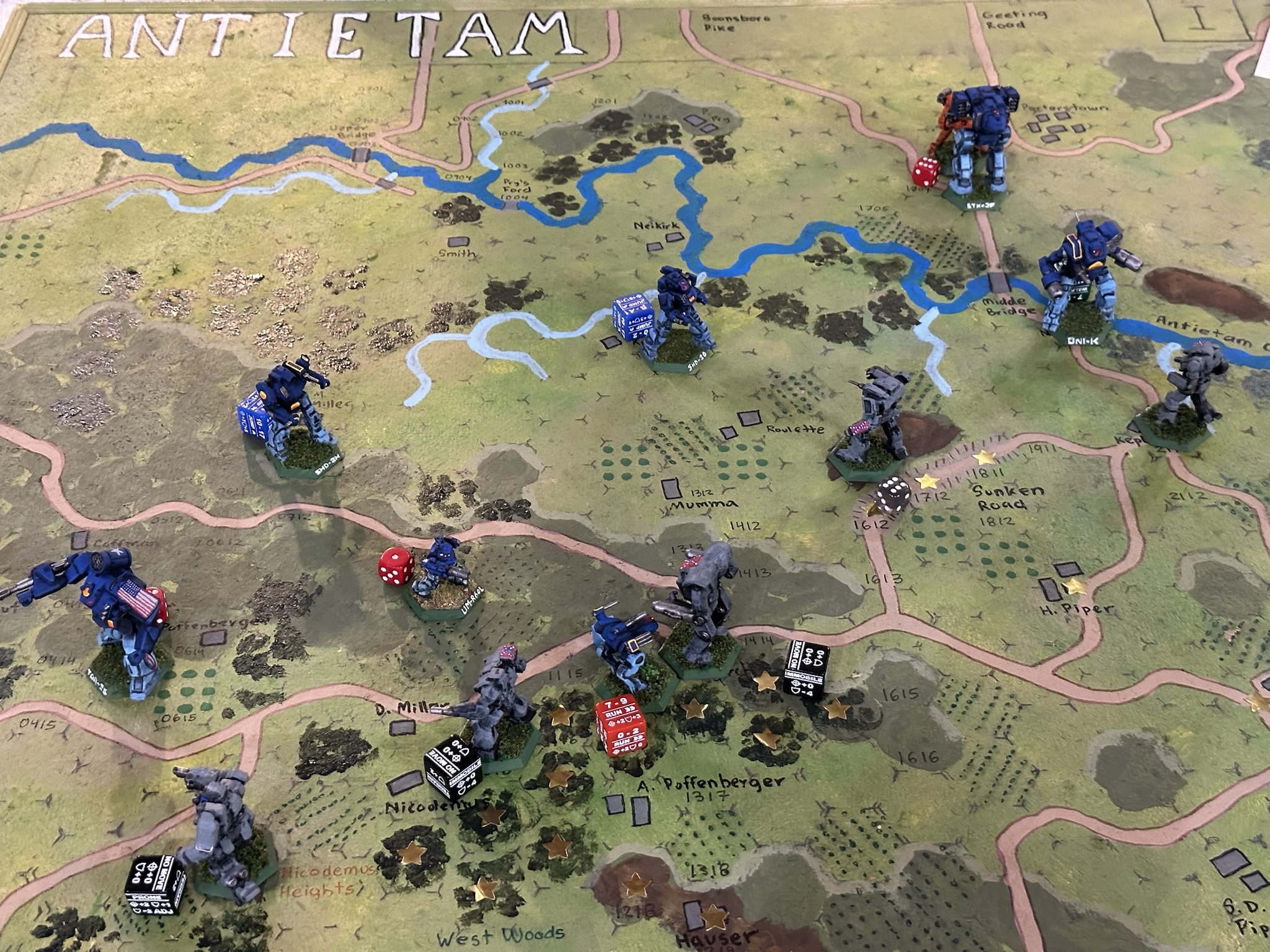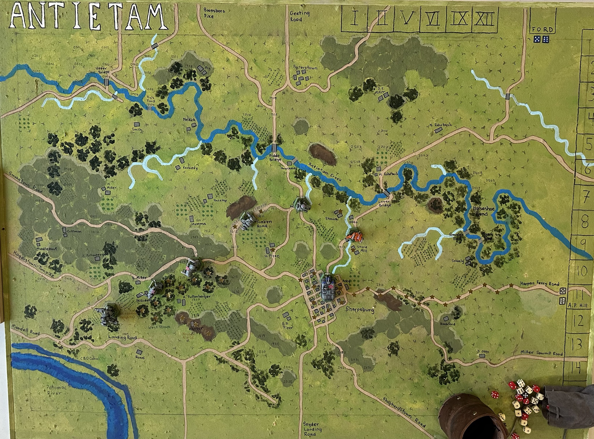 A hand drawn/painted hex map for the Battle of Antietam