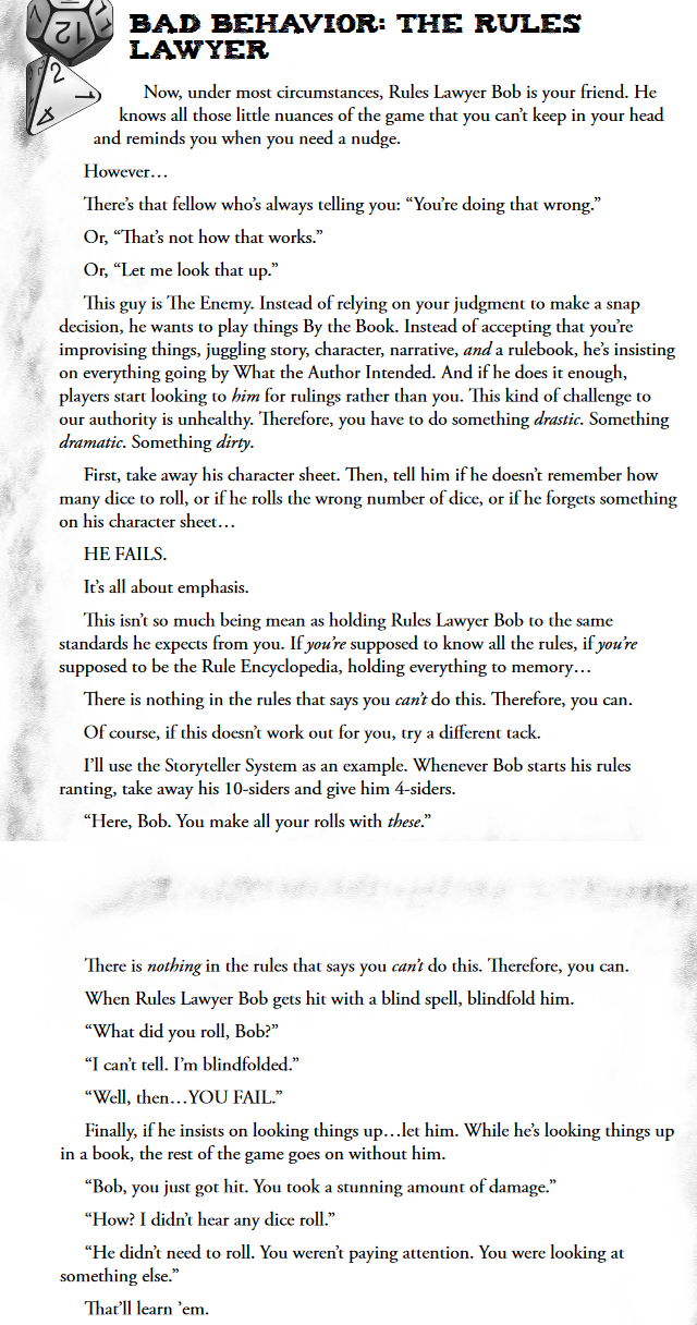 TTRPGs are a social game first and foremost. That means there's unspoken rules that vary from group-to-group, but a common one is "acceptable breaks from sensibility" in the name of game experience or table cohesion. It's the kind of thing that keeps the bitter rivalry between the Elf and the Dwarf largely to amusing banter and not outright PvP. It's an innate instinct: nobody likes to spoil the atmosphere, because that's a large part of the appeal of a good game (alongside the freedom).That being said, there are also times when the group's course of action is patently retarded and you can't meaningfully push back on it without feeling like you'd cause a big fight over nothing (and then feel obligated to keep comrades away from the consequences), or something a character cannot abide has to be "sanded over" somewhat, or you as the GM don't want to cultivate the feeling that you're antagonizing your players by hitting them over the head with "you murdered someone because it was convenient and didn't even take measures to cover your tracks" or whatever unhinged misadventure occurred because something about the player position of the table cause human beings to lose IQ. Have you ever had that feeling? I think I see enough greentexts to think it's common.