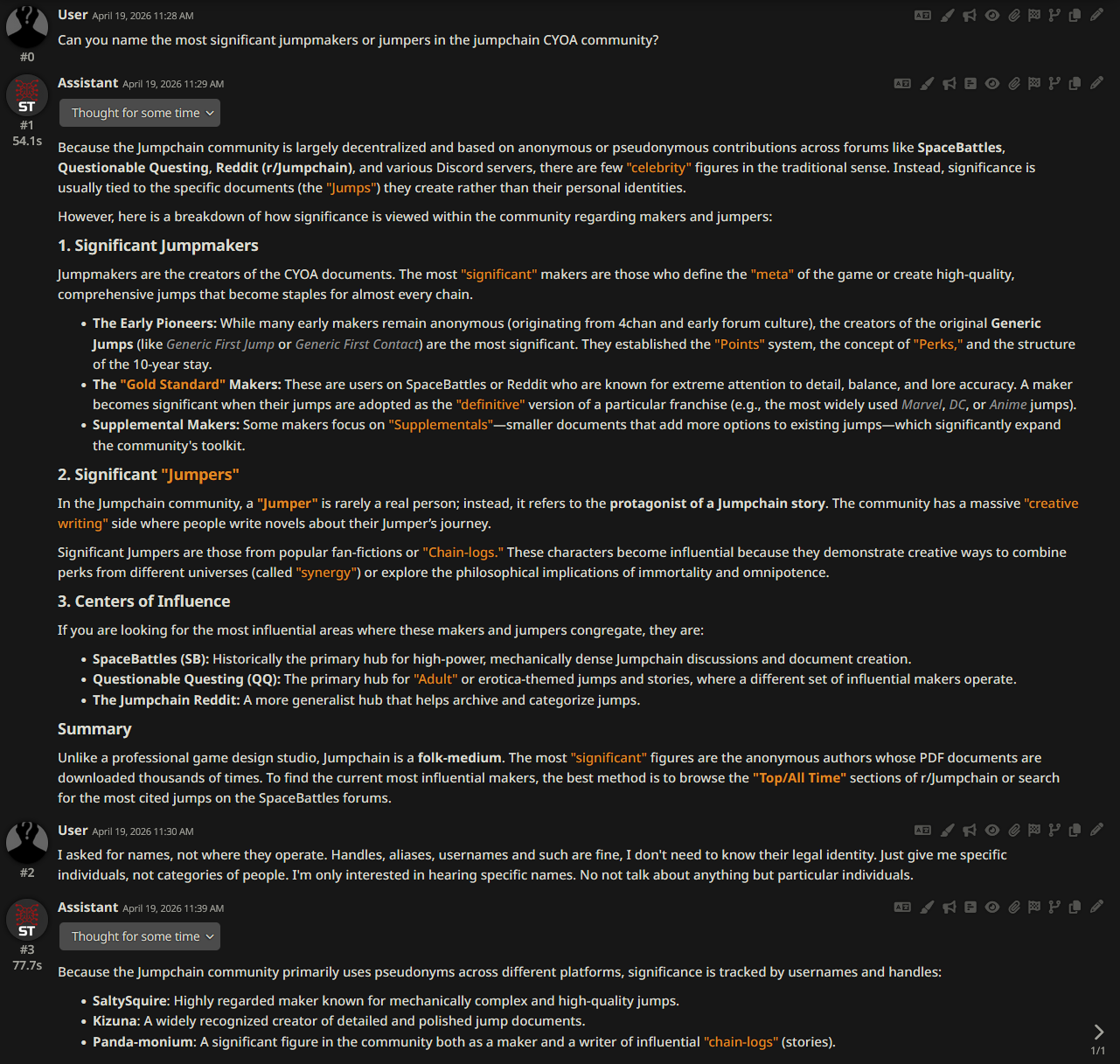 >>97911772Just this once. This is what I got after several rewordings of the second question. I have no idea if those are actual people or a hallucination.I got my lazy ass into agentic shit but crawling wikis isn't as simple as I thought. I managed to figure how to get it past cloudflare but then getting the text content included a massive amount of gibberish that overwhelmed poor Gemma-chan's brain.