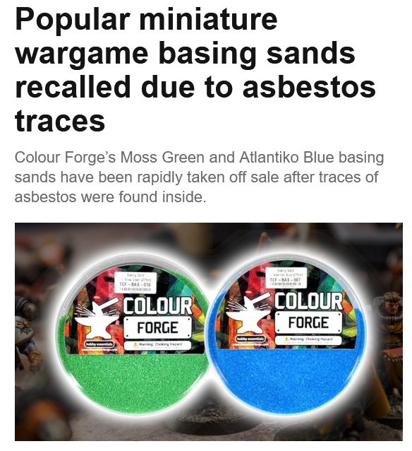 Have you been huffing asbestos at your wargaming tables, /tg/?>Colour Forge’s Moss Green and Atlantiko Blue basing sands have been rapidly taken off sale after traces of asbestos were found inside.>If you're using Colour Forge's Moss Green or Atlantiko Blue basing sands in your miniature wargame projects, stop using them immediatelyhttps://www.gov.uk/product-safety-alerts-reports-recalls/product-recall-colour-forge-basing-sand-2-colours-moss-green-and-atlantiko-blue-2602-0038https://www.wargamer.com/miniature-wargame-basing-sand-asbestos-recall