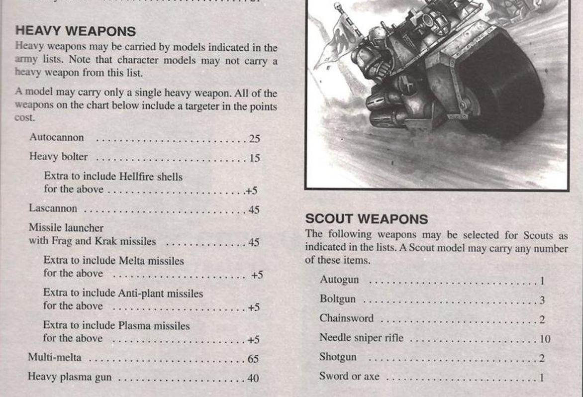 >>96727055Well, in 3rd / 4th I think devastator squads has access to some weapons like multi-meltas and plasma cannons that tactical squads can't take, dark angels and salamanders having some exceptions, I also think the 4th edition marine codex had some chapter traits that allowed different heavy weapons.