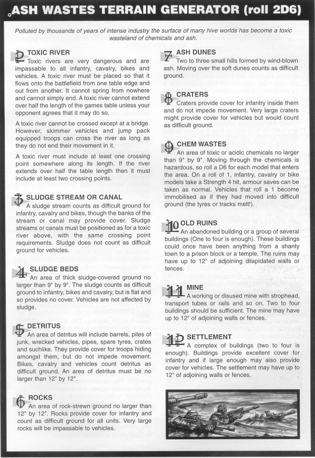 >>96608359I'd ignore the vehicle manual, it's pretty arse, the datafax system from 2nd did everything it wanted to do better, you could straight up use that if you want including 2nd ed. points values for vehicles. Battle Manual is a good cleanup. There's also basic fixes and tweaks the system got through white dwarf updates as well that the battle manual collates well without having to go chase things up. As for supplements it really depends what you have to play with. No point fucking with dreadnought construction rules unless you're gonna be kitbashing your own dreadnoughts or trying to backdate some more modern models after all. And treat points costs and army lists as guidelines or the building blocks of what a force should be that you can then take units from, because otherwise they become too unwieldy in places. A classic example of this is the compendium Imperial Guard list mandates a full 46 strong platoon of infantry before anything else to do anything, which is thematic but not really useful as it's over a thousand points with the mandatory command too (and a not insignificant chunk of that points cost is lascannons that by default can't be swapped for anything other than conversion beamers, and the grenade launcher can't be swapped for anything other than other heavy weapons so by default you can't match any later Guard squad builds which have been the standard since 2nd edition). You can also ignore the random generation in part, but not always as sometimes the randomiser is supposed to be there as a balancing tool in a mad way like with Ork kustom guns. One of those things that requires judgement and cooperation. I'd say start basic, but do use the Battle Manual from the beginning. Battle at the Farm is a terribly unbalanced scenario so know that if you play it.
