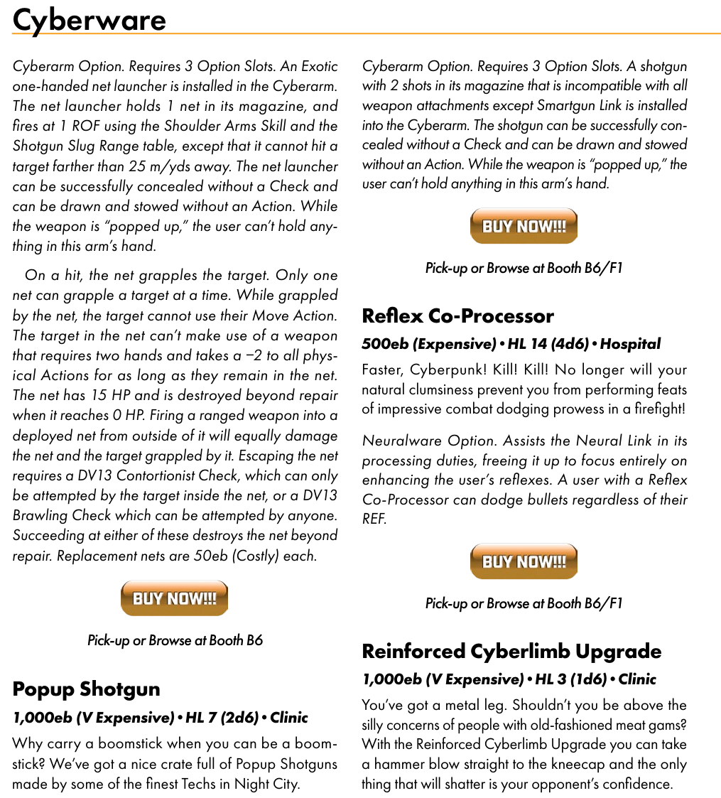 >>96659465Neural Links and Plugs are fine because they have an actual purpose, I don't have issues with prices, if anything I'd be fine with some upgrades being made more expensive if it meant they provided some real value.The issue I have with subdermal armor in RED particularly is that its basically just starter armor but expensive. It slowly self-heals but that really isn't all that useful. It seems like the main sell is to just give niche social benefits like the ability to enter a club while saying you still look like a normal person. This is a dumb philosophy for cyberware as it mechanically hampers your social abilities by default.