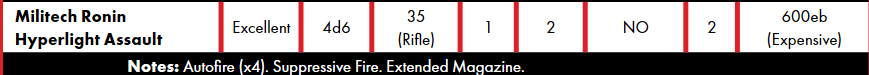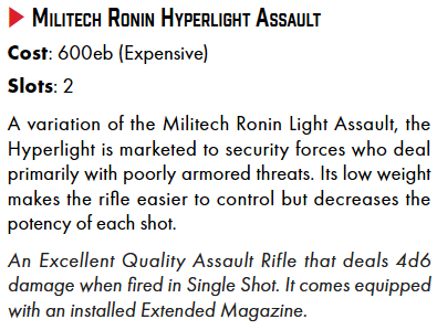 >>96778337The handgun skill is pretty great since you get pistols, single-fire smgs and the Militech Crusher (it has vh handgun damage but uses shells which are like small grenades for 1/10 the price). The downside is you don't get access to the 5d6 damage weapons (I love my 20% crit chance and so did the core rulebook where every gonk had a poor quality shotgun/assault rifle) but if your long rifle gets checked at the door what's the point? Shoulder arms are great but for lawless situations (aka the combat zone).I do feel like most cyberpunk encounters will be at insanely close range (back alley, shooting between offices, make-up room dispute, etc). Maybe someday we'll get carbines which are assault rifles with smg ranges. Maybe Rusted Chrome in 2 yearsAssault rifles are nice because suppressive fire can potentially waste the turns of multiple enemies. Sure you can kill one enemy in a turn, but what about making 3+ enemies useless for just a single action? Normally NPCs have uniform skill bonuses (like +10 to everything) but I penalize skills like concentration or resist drugs/torture unless the NPC's are pros because most people wouldn't think to guard themselves from these attacks. Another assault rifle benefit is they have the damage of a shotgun with a much bigger magazine. And if you're a player shooting NPCs, DV17 isn't THAT bad. Especially when most players are going to min/max and get +14 at chargen, so you have a 70% of hitting at your worst times. If you think about it 5d6 damage is authoritative damage. The gang that owns the area, the security watching an event, the bodyguards for a VIP, etc. It's meant for the bad guys so if they actually hit it will hurt. Players make due with the RoF1 4d6 or RoF2 3d6.