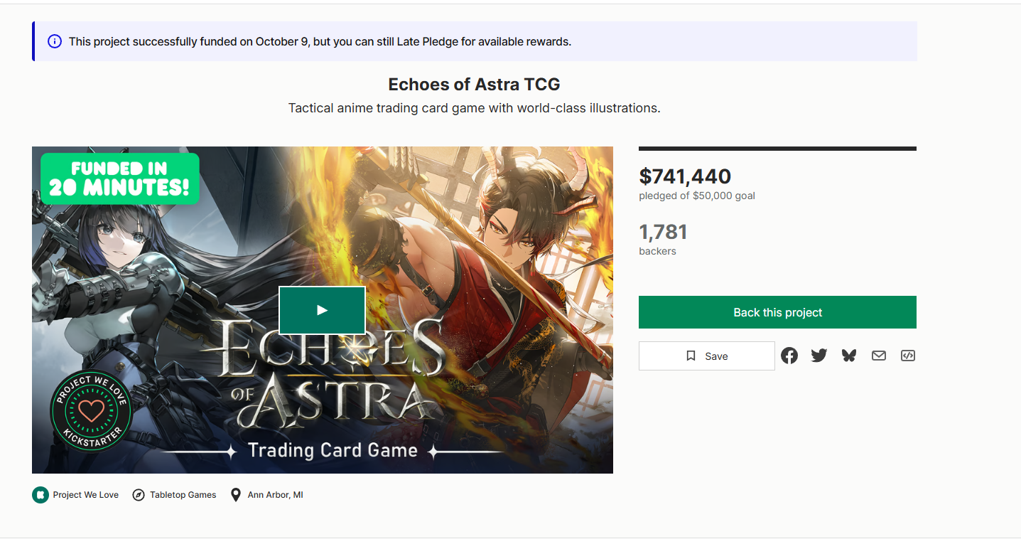 >$1 millionThis game better be easy to find in person.https://www.kickstarter.com/projects/echoesofastra/echoes-of-astra-tcg