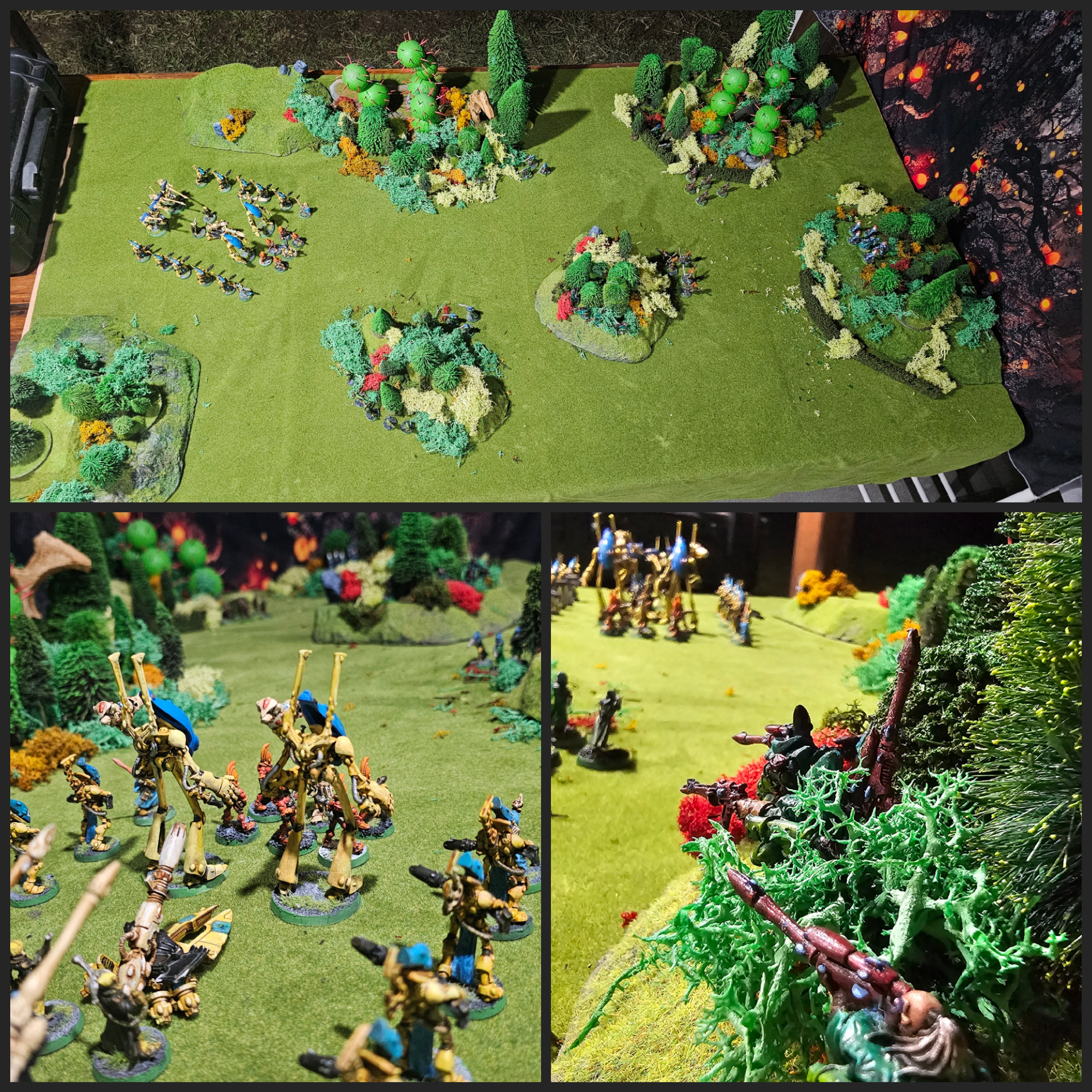 Basic tips for making a better looking table1) Make coherent terrain, think about where your board takes place in, and place your pieces as if you were recreating a real place in the setting rather than an artificial paintball arena. A major issue that I see in bad terrain images is that players blindly take whatever terrain pieces they have available at the local shop terrain shelf and throw them all over the table with no coherency or theme. Avoid this at all costs. Do not put tree terrain on a volcano mat, do not put buildings on top the roads on your city mat. This should be self explanatory to anyone but unfortunately needs to be said still.2) Make hills for 2D mats environments that would realistically not be a flat surface. A city or village mat being flat works mostly fine, but if you're playing in a forest, desert, mars, etc. the flat board will look out of place and strange without some hills. Even making a few large platform hills to break up 30-50% of the table into elevated terrain can instantly improve the look of a neoprene or cloth mat tenfold. 3) Do not care about symmetry or competitive play layouts. Avoid these like the plague, they always look unrealistic and bad. If someone at your group insists on using these layouts then try to convince them otherwise, and if that fails, refuse to play with them. Foster a community where to get games in people need to put in effort to make the board look good. 4) Objectives. Objective markers are no different from any other terrain piece. Make sure they match the rest of the theme of the table. Come up with an idea of what the objective represents, why would the armies be fighting over them? Of course, avoid neoprene circle objectives at all costs.