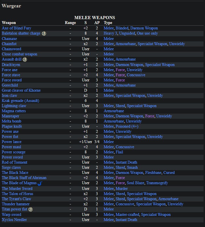 >TQI miss when you just had a war gear list where things costed points, so you could have like a Chaos Lord on bike, jetpack, terminator armor, any of the 4 steeds of chaos etc etcI miss OPTIONS. I don't want to 2 datacards for "Scourges with Heavy Weapons" vs "Scourges with Shardcarbines" I want to be to take an Archon on a jetbike. I want my chaos berserker squad leader to be able to take lightning claws and a mleta grenade. I want my sister superior to have the OPTION of chainsword, power axe, power maul, power sword or eviscerator not JUST power weapon vs chain sword. I want to look at my character model and see "This character can choose any weapon from the melee weapons list" and see like 15 different weapons for me to choose from