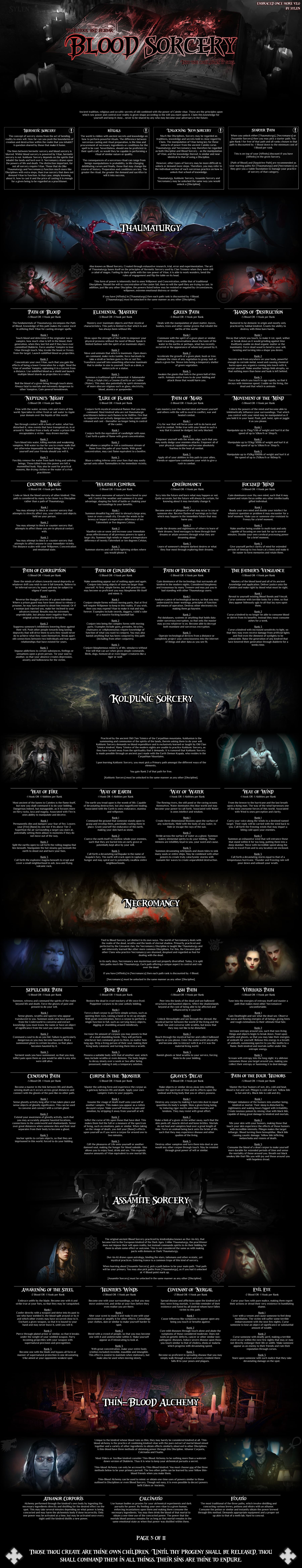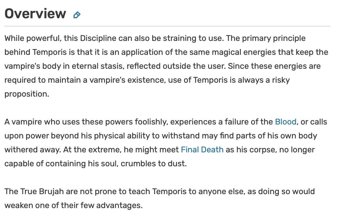 >>96727851You're right. I will fix that.>>96728009Elaborate anon>>96728277Mages don't necessarily exist in the same manner that they do in the World of Darkness. Thats up to your headcanon. Yes, it makes Tremere history and background more dubious, but that could be a good thing.>>96728349Yes, its on top.>>96728385Sure, just have a Salubri vampire as Contact and spend a Hook to learn it.>>96728593>>96728602Mages aren't necessarily canon if you dont want them to be.>>96728642There is a small line about becoming independent, which would serve as the "Canon" option for Giovanni and similar.>>96728886Yes, as long as you roll first and not after.>>96729363It makes being Social more spicy, but would not outright gimp it.
