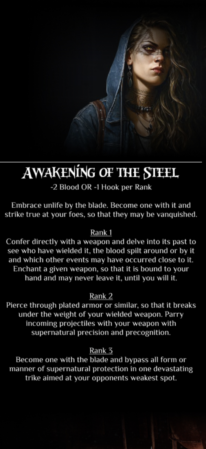 >>96724137>Generation of Sire -5 Favor +5 Fame and +5 Notoriety6th Gen>Disciplines of Sire (1 Blood left i cant spend)Auspex(Affinity) 4 Celerity(Affinity) 4Presence(Affinity) 5Fortitude 4Obfuscate 3>CharacterBodySocialAppearance+EmpathyIntimidationLeadershipAwarenessSubterfugeStealthMeleeExperessionInvestigationOccult>Traits and Personality (dont know how to roll in thread so rolled outside 11 9 1 7 1)double 1 Preferred Sex (Upgraded)7 Influential9 Depraved (Upgraded for that Life Boon after knowing im gonna be on the run)11 Prankster>Behind Curtains (4 9 9)4 Feeder double 9 Illegal Embrace +1 HookPowerplay(Upgraded) what the hell man, we just gonna full on risk this now +1 HookTurf Wars>Relationship GoalsDefection - I dont know what kind of fuckery this sire is up to, but all bets are on learning enough and then trying to rejoin the Camarilla later---------->My Generation7th Gen>AwakeningNot of this World>ClanToreador>OrganizationCamarilla Rolled +1 Hook>Unnatural Embrace -1 HookMark of Caine (Quietus) +5 FameBound WillpowerRepentance of the Beast(The Sun) -2 Blood>Curses and BanesObsession 2The Sun 2Fire 3Manifestation 3>Disciplines (13 Blood to spend to begin with)Auspex(Affinity) 3 Celerity(Affinity) 5Presence(Affinity) 1Fortitude 2Obfuscate 1>CharacterAppearance+ -1 HookMindExpression (Free from Appearance)Alertness (Free from Mind)AwarenessMeleePerformance(Dancing)(Continued)