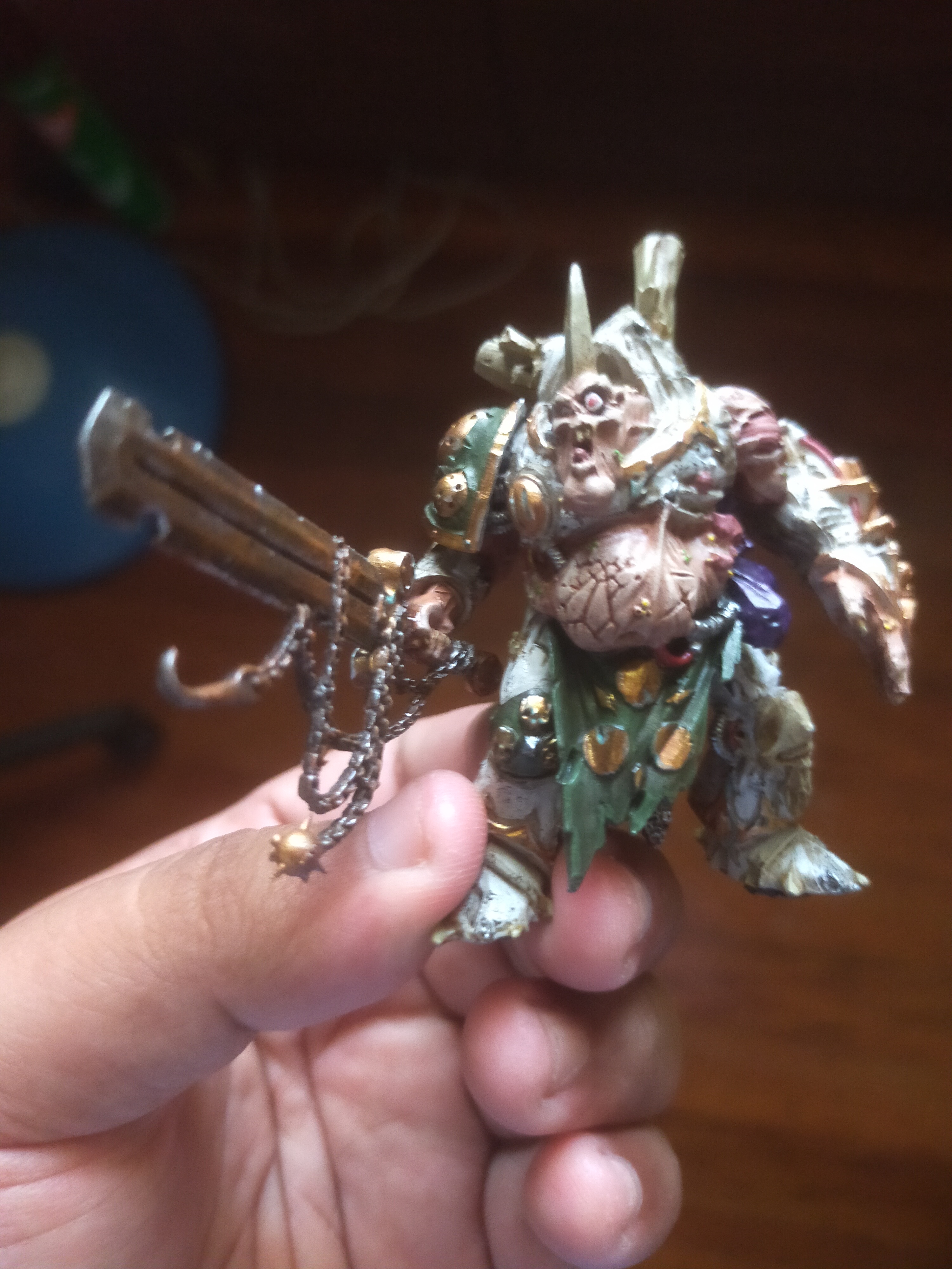 I am developing a love hate relationship with my army as I paint more and more of it. On the one hand I love how it looks, I love the lore, I love the concept of rotten, shambling marines advancing slowly and contaminating everything with their presence.But on the other hand the models are so overdetailed it's actually starting to impact my enjoyment of painting them. Every single nook and cranny has something. You thought this was an armor plate? Actually, there are leeches poking from underneath. There? Some tentacles growing. What about there? Horns, and the horns also have slugs on them by the way. What about the cloak? Oh, it actually has some hanging cables. Well, I guess the gun is just corroded metal, right? You thought, here are some fungal growths and for good measure put some parts of skin/flesh in the gun barrel. Oh and there? There's clearly pus seeping. And while we're at that why not put some pustules on the flesh? And why not take this one plate that seems flat and put a nurgling peeking from it? And why not add some skulls hanging here? And why not add some more slugs to the skulls? It's not even that I have to paint all of it, or that it takes a long time, I don't mind that, it's that the model feels SO cramped. I feel like I never have space to make smooth brush motions because every single time I try to say, glaze something in an area I have some growths to the left and a gigantic kneepad that has a massive horn which for good measure has some slugs and poison seeping. I'm closing in on 2000 points painted so I'm going to keep powering through it but man. I painted some orks as a palate cleanser some months ago and it was so enjoyable to just be able to glaze and work on the skin without continuously bumping into details. Sorry for the wall of text, I have no one to talk to.