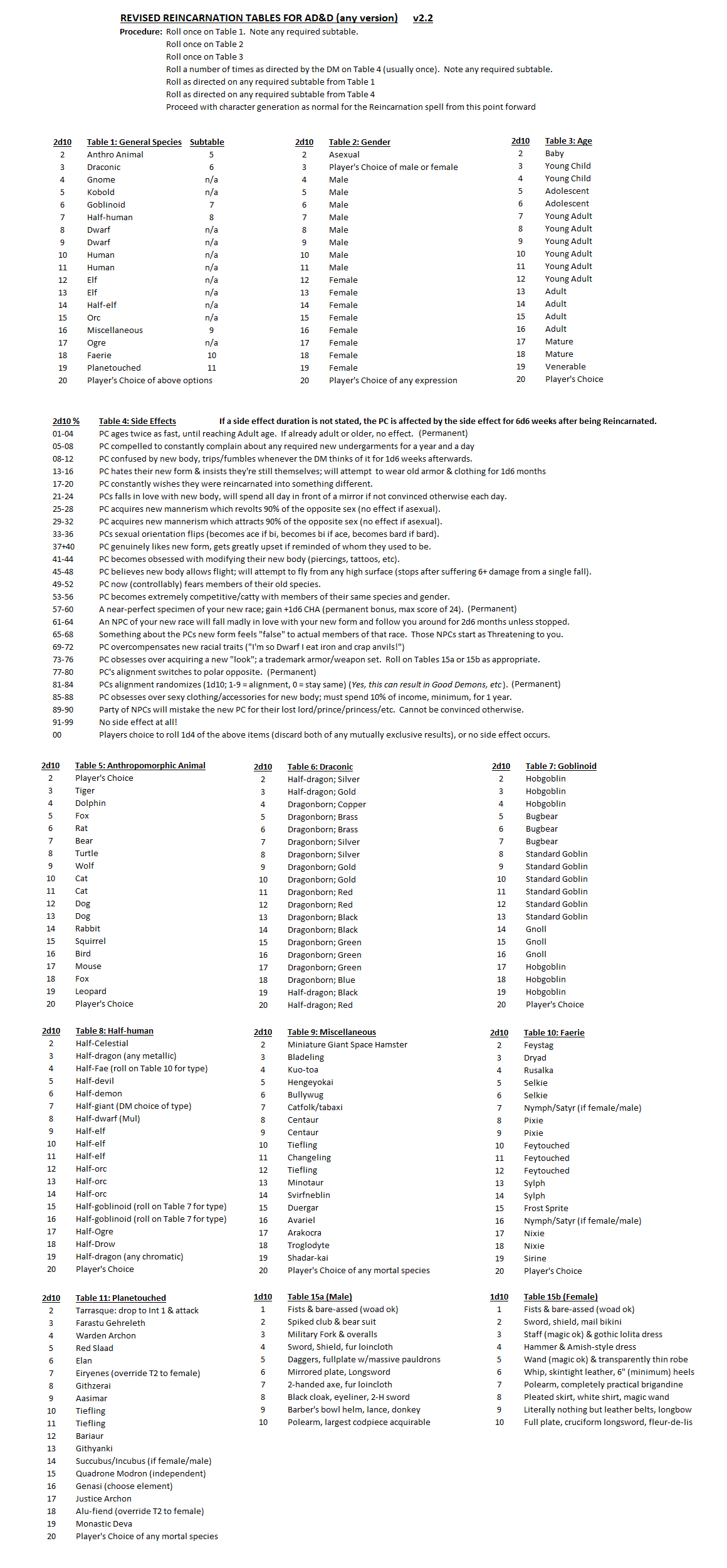 >>96768137>How did it go from there? Pretty awkwardly for a good while. Luckily there was some armor with the "fit the wearer" quirk on it. We had some fun with it for a bit; the other girls in the party "adopted" her pretty quick and taught her the ropes. It's been about 3 years in game since it happened, and she's kind of made her peace with it. Note also we agreed as a group not to be all weird with it and not make it a huge game focus, since it wouldn't be fair to the other 6 people at the table to monopolize the RP time.>>96768990>Post itMy DM is ok with sharing it, so here. Hopefully it's stays readable. I'll also throw in the Tiefling appearance table that he uses in the next post. Also I was wrong. It was a reincarnation side effect that gave the CHA bonus, not a tiefling ability. Still, though.