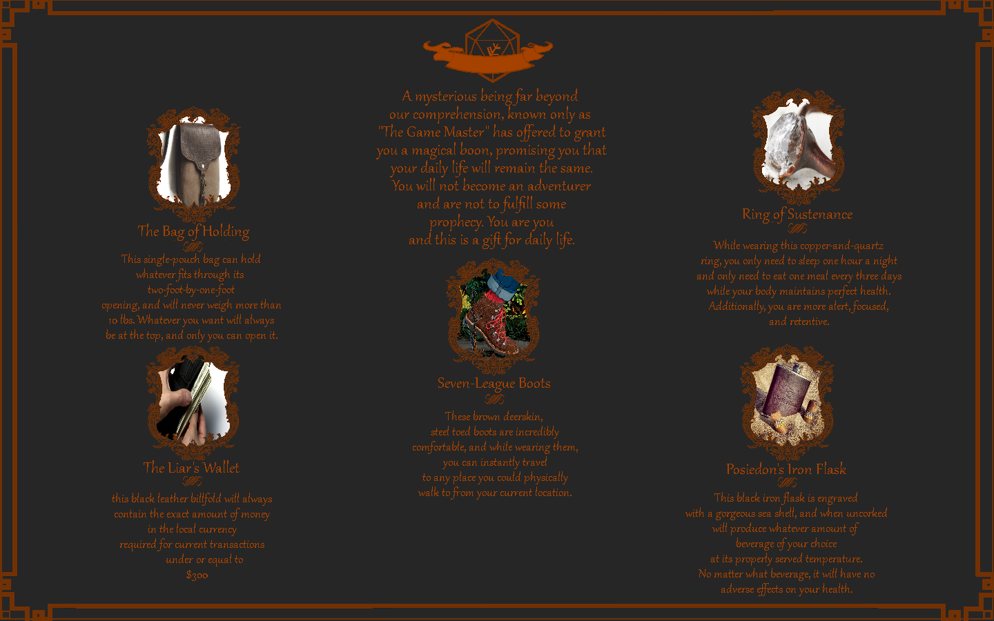 >>96771728>Emperor and legacy have to be picked in every build and you couldn't stand it if they weren't?I tried making them as equal as possible, while still being fun to read/pick. If they aren't it's because I'm not great at balancing or writing these, not because I'm making pet options. My favourite was the Mentor Ring and it was one of the least picked :(