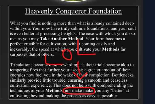>>96775891>>96775931I think the logic behind is that picking the Foundations, makes you go faster, because you don't have to work on your foundation, while technically you don't get more talented in improving the rest, you simply are ignoring a part of cultivation because you have it done.While Peerless Prodigy know how to improve. You don't need a teacher.