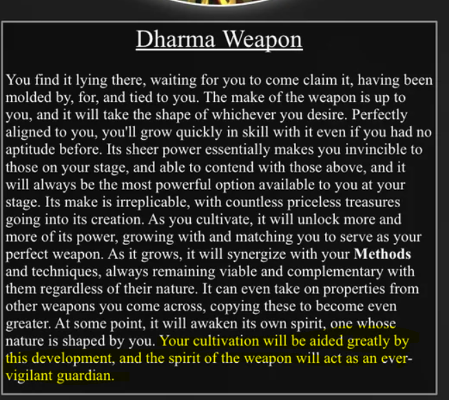 >>96776060I would add the Dharma weapon instead of the Auxiliary master. Because the Dharma weapon grows with the user and copies the abilities of any other weapon, making it a potential weapon, then it helps with cultivation.And the best part is it becoems alive at some point, that plus Protagonist Aura becomes a companion that will get improved by Protagonist Aura, which improves you.