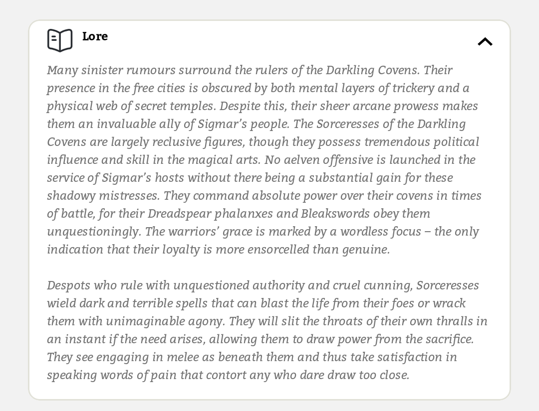 >>96774297The Freeguild Marshal on Griffon represents a Freeguild Marshal on Griffon The Sorceress represents a Darkling Covens Sorceress, hence it explicitly stating as much and including her signature Cruel Sacrifice ability that represents the fluff You are just wrong.