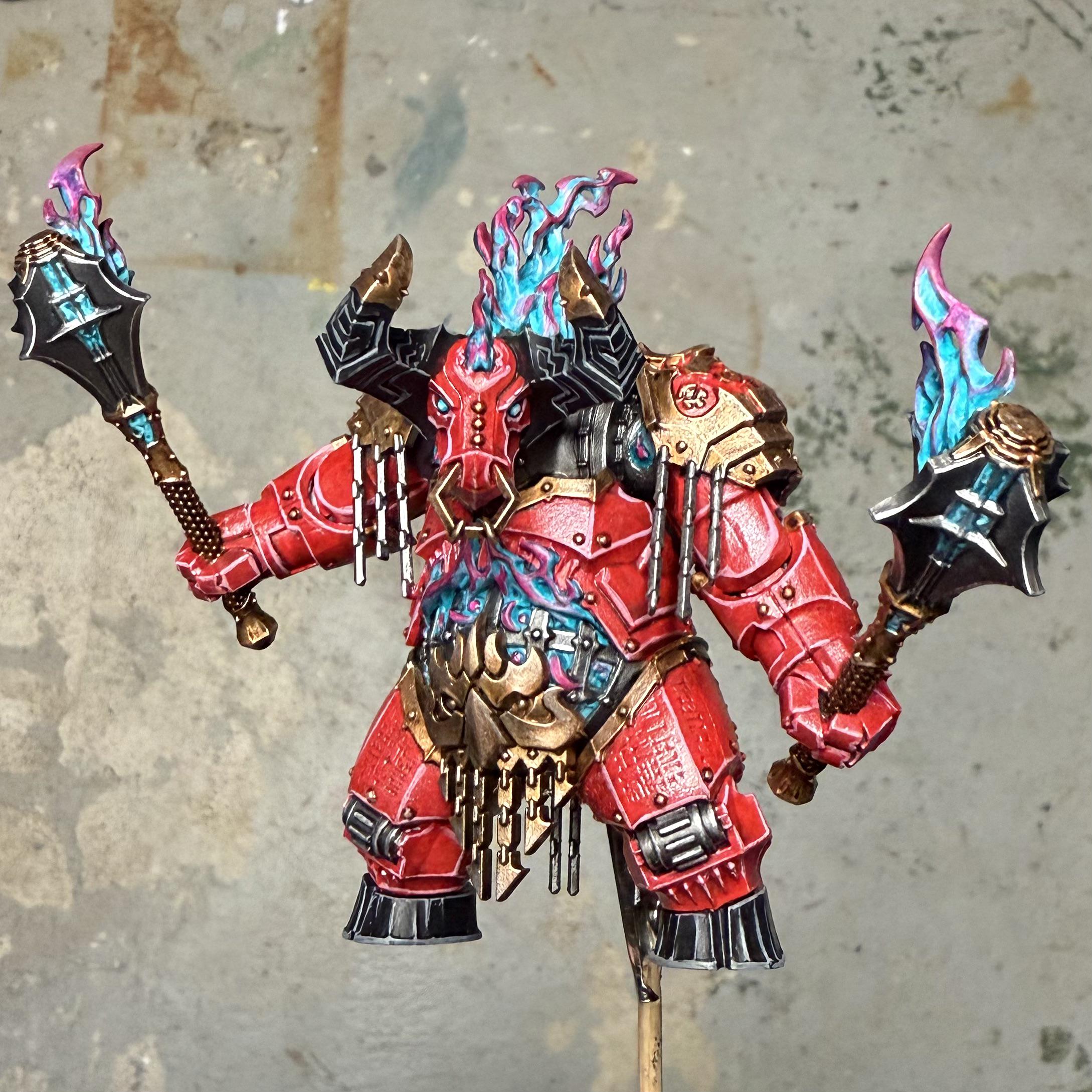 I think this paint scheme looks really, really good.>Luke T: I took inspiration from the House Malinax Knights scheme seen in Warhammer 40,000 and The Horus Heresy, as I felt the dark metals, grubby bone armour, and red spot colour reflected the Helsmiths’ diabolical nature. For the bases I referenced artwork and photography in the battletome, which often depicts the Zharrdron standing in their forges over molten pools of metal guarded by grates, and picked up some Void War bases to represent this environment.https://www.warhammer-community.com/en-gb/articles/uwghdhhv/the-warhammer-community-team-pledge-themselves-to-hashut-by-painting-some-zharrdron/