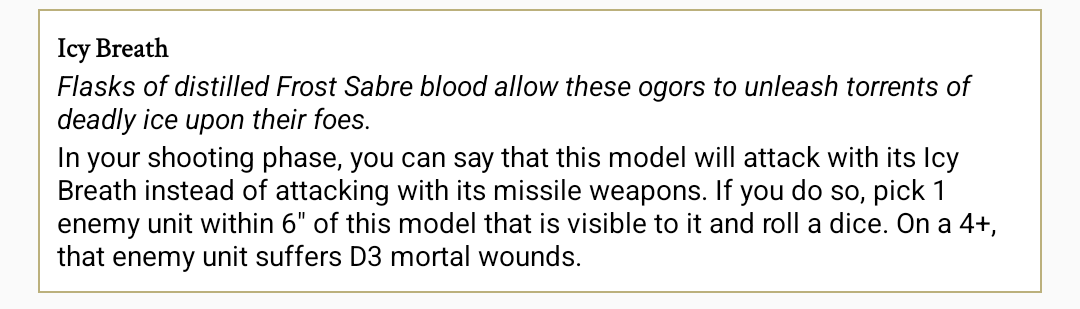 >>96773163>TQ>OgresThey sure don't. The easiest thing would be a Frostwyrm of "Frostwyrm Elixir" fame, it would be like any other dragon but worse because that's destruction's shtick. If we're talking about a multiple model unit, that's rough. Unless they start strapping gyrocopers to their backs I can't see a unit of ogres flying. I could see gnoblars in a battle balloon. The problem is Ogre's tech level is schizophrenic and their magic is rigidly themed. Any gastro magic that gives flight is going to lead to fart jokes.