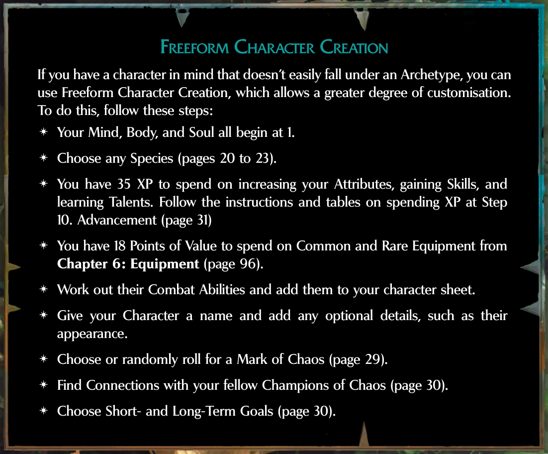 >>96777575>racesZharrdron, I suppose. Or some of Warcry's monstrous units like fomoroids, sphiranxes, and centaurions simply for a meme tier option.>archetypesThe Curseling has a fun gimmick that could be fun to roleplay.Frankly most of what I'm missing in terms of character creation are the subfaction rules from all the previous books. I get that the mutations more than make up for it, but it's still one of those flavorful things I'd come to expect out of the Champions of Whatever books. Being able to slap an Idolator, Ravager, Despoiler, or Cabalist bonus on a PC right at character creation would be gratifying. And oddly there are also no rules or pointers on how to handle a PC's ascension to daemonhood. It's odd because that's kind of the endgame of the whole Path to Glory that's supposedly the core premise of the game.