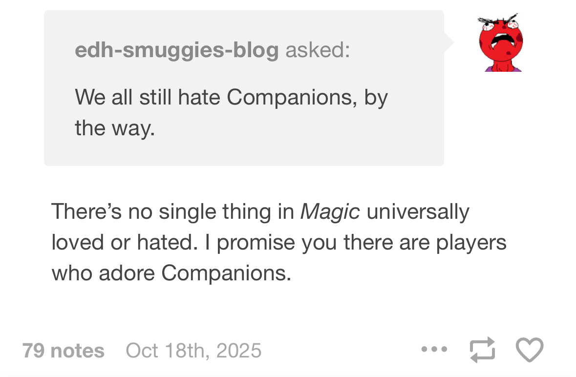Every single reply to this is “I LOVE COMPANION!” if you wanted a metric for how intelligent MaRo’s ballwashers are.