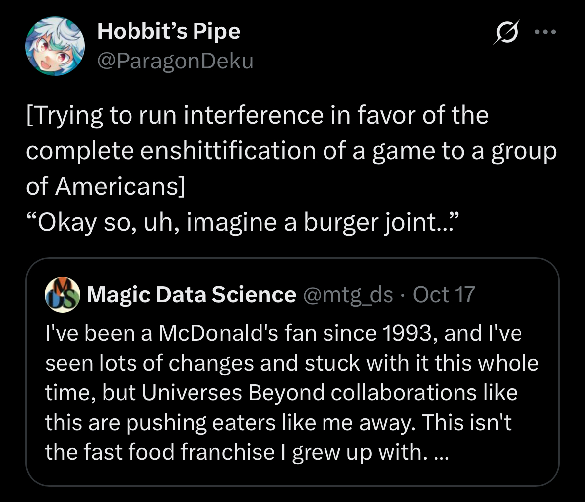 >>96787553>compares MtG to actual slop to defend it against the chuds who call MtG slop