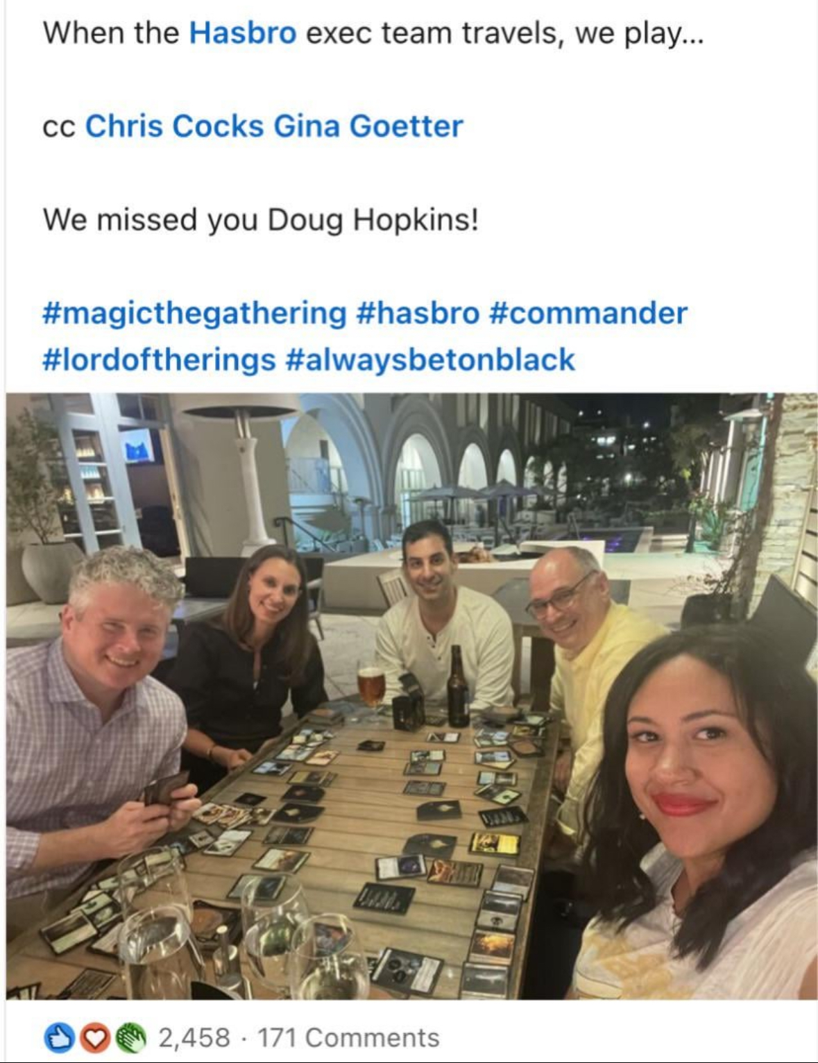 >>96791236>>96791351It's hard to hate them when the play like such chads, but then I remember it's commander and they only do it because they are rich and know nothing about magic. Fuck hasbro and every stain on humanity in this picture.What are those piles of cardboard with the planeswalker symbol on the back though? Official C-suite proxies?