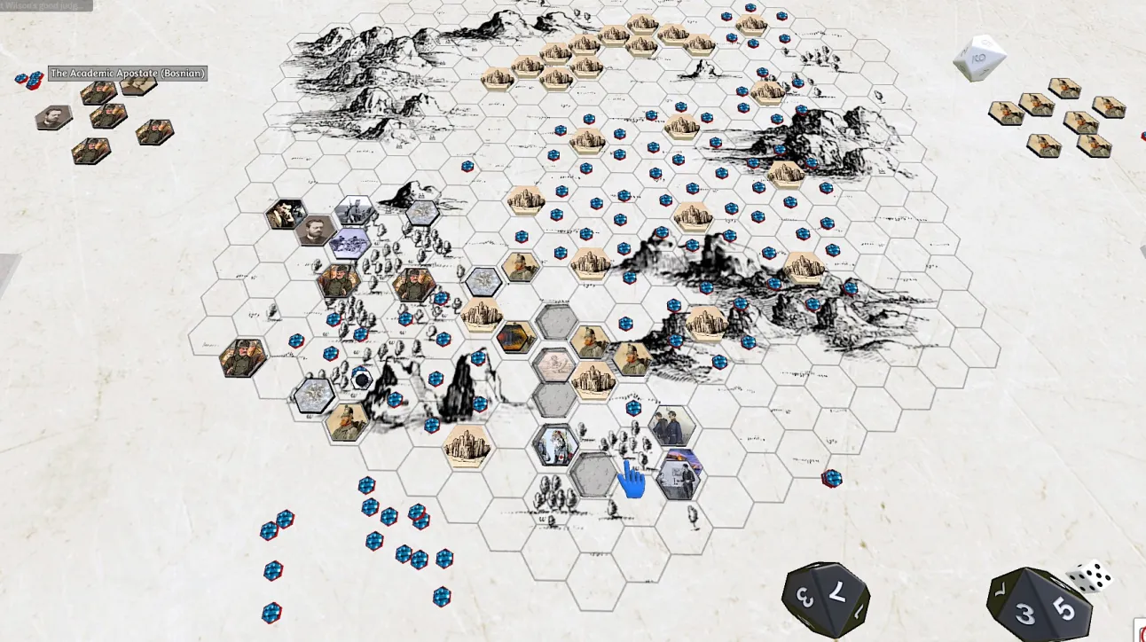>>96799380>more death in the lower corridor, this time on both sides>i am forced to rally again, and this time to spend 1 LP, locking me out of "letting all men know">Warm Meals are given to the late comers, and one Snacks while the other Affixes>the Landwehr in the upper foothills and the north most Revanchist exchange hits>the Revanchist with the Pyroclastic Flow had eaten a Warm Meal himself last turn. i feel very much like i'm screwed, him having eaten too early, preventing me from using the Pyroclastic Flow to it's full effect without condemning him to death. 2eanon and i work out how i can make the most of a bad situation >he engages the Landwehr in the foothills using the extra movement from the Flow, Grievously burning the already Deeply wounded Landwehr>he then unloads his Kalthoff into the burning man, revealing them both of the need to Disengage >with the tip of his Affixed Bayonet, he swiftly removes the near Anomalist's head, before booking back behind the Wall>the Landwehr are now Panicked, forcing 2eanon to Rally. >i move the Agarthan Fisherman up