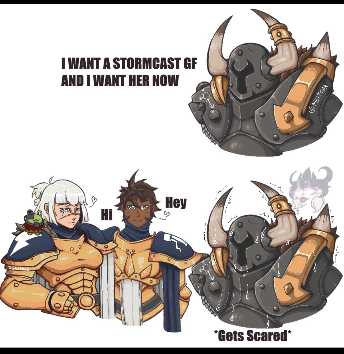 >>96802543>Like when could Stormcast females even "act" sexy?When they're shown without a helmet they have an attractive face and have a haircut that isn't the cliche standard side shaved butch lesbian style. That's literally the lowest effort they have to do. Slightly more effort is giving them more slender builds.