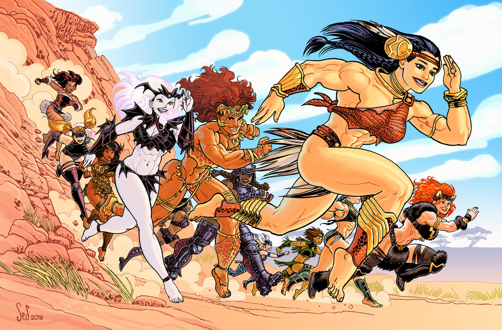 Be honest OP, do you actually want to build a setting or do you just want softcore muscle girl art and veiled smut talk?