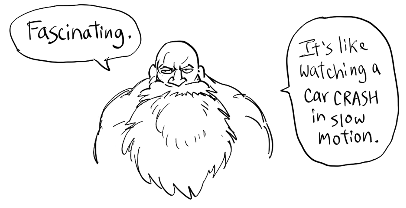 I got a chance to do the "I said I cast Fireball." meme.Was playing the party wizard and started rummaging through a shelf full of scrolls. DM had me roll to see if I find anything good. Rolled well and found a Scroll of Fireball (5).I'm only level 4. I can only cast L2 spells. The scroll is over twice my power level.I search the shelf again, roll hot, and find another Scroll of Fireball (5). Then another. Then another. On my fifth attempt, I fumble the roll and the shelves collapse into a pile of rubble and dust.Next combat, our group is fighting some sort of Mind Flayer. Again, we're only level 4, and Mind Flayers are CR7 in 5E by default. I get incapacitated almost immediately (don't remember how exactly). The Barbarian and Cleric are tagging out each round to not die while I'm trying and failing to break free of the incapacitation each turn.Barbarian goes down. Then the Cleric. Fortunately, they had drawn the fight away from me.The mind flayer advances towards me. I finally shrug off the incapacitation. I pass my Arcana check to cast a spell beyond my level. I cast Fireball (5).Next turn, I pass my Arcana check to cast a spell beyond my level. I cast Fireball.(5).The mind flayer goes down.I pass my Arcana check to cast a spell beyond my level. DM asks why I rolled Arcana. I cast Fireball.(5).
