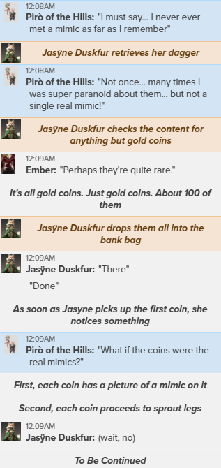 >>96969077bringing us back to the other planes i had found myself on during the adventures. one of em had a timelesness quality. anything that took longer than a round there jsut didnt change. you didnt age magic effects didnt end, ect.so i skulked my way back there.and i hid out. i made a mean peice of work wizard. and had him wait outside the timeless realm nd return once the item was charged.he came back and i made another wizard... the same wizard.you can guess what i did next.needing no sleep it was just counting coins and studying strange texts till the wizards returned.now what does one do with a steadily, infinitely growing army of wizards.well one raids dungeons of course. every dungeon. if gods werent watching it my simulacrams cleared it of valuables and kidnaped the monsters within.and there i sit to this day. ageless. glorious. in an out of the way podunk demi planecontributing my meager ability to the army of wizards bringing in more loot to turn into simulacrum factories and whatever the hell else i want.