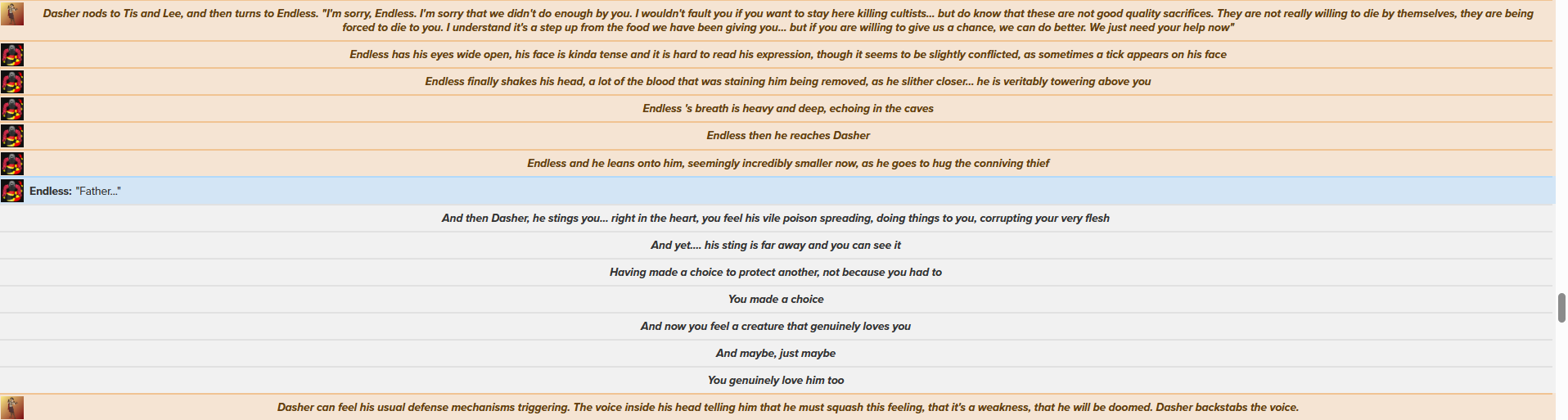 >>96980697>party comes back to base and has to setup defenses>where the fuck is Endless>apparently the enemy cult dig tunnels under the base to collapse everyone and everything since it was built on top a mountain>Endless dig down to stop them and keep things stable>however it was a trap>the enemy cult is sending their own to "attack" the godling so he will eat their flesh>like a shark tasting blood they hope to either make the godling sated and unwilling to stop feeding or to turn against its own cult>party goes down the tunnels>finds Endless feasting on living sacrifices>Endless is pretty excited>like a kid holding an hammer after drinking an energy drink>Lee and Victoria try to calm down Endless and get him out of the tunnels to help fight off the incoming assault above ground>Endless seems annoyed at that saying he prefers to stay underground and finally eat the offerings he so dearly wanted>Dasher stays silent>Lee and Victoria continue to say that it is bad and they will give him what he wants after>Endless is getting pissed off and points out his so called 'Father' is being weirdly silent>I bring up Endless sheet ready for a long and vicious fight as they inevitably will have to kill the god child>"He's right to act this way">I put the sheet aside>Dasher claims they haven't been looking for Endless interest's after all>sure it is convenient to have him to their bidding but they are not trying to make him grow in a way that benefits him>they just want to shape him in a way that is most convenient and will cause the least problems>to truly look after his needs is to say his unnatural hunger and to put his well being as a priority>everyone is stunned including Endless (aka me)>Lee and Victoria end up relenting that they could find a compromise after all>maybe give him space to inhabit a village or what have you>grant his followers blessings and services in exchange for sacrifices if he so desireMan 2000 words isn't that much 3/4