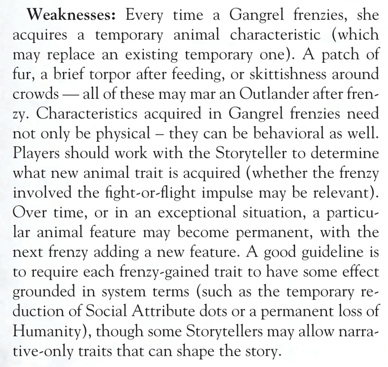 >>96838092>You're an unstoppable engine of destruction whose incapability of keeping their inner rage at bay has historically fucked any chance of working together with their peers to accomplish their literal reason to exist, but hey of course using a mechanic for that is an agency-depriving no-no so feel free to be an unstoppable engine of destruction whenever you feel like and be the bestest of boys boop the snoot at any other time.My first character was a Rage 10 Ahroun, because I had no idea of how the system worked so I listened to the table telling me (probably because they were used to the forgiving attitude of the ST towards Rage rolls) to spend all freebies on that. And honestly I was a bit disappointed when I found out that I was indeed supposed by the crunch to fly off the handle because somebody looked at me funny. Sure I slapped some bitch around (none of which had to roll Rage either of course) when the pack was having disagreements, but "I hit you ONCE to get my point across and/or because you're not honoring hierarchy" is a much different thing that "OH SHIT HULK SMASH HOLD HIM HOLD HIM DOWN FOR GAIA'S SAKE".If you don't play every garou (except one SPECIFICALLY built against that) as on the constant verge of roid rage you're doing it wrong: oh, cool, you can kill anything and have no other problem whatsoever, la di da.