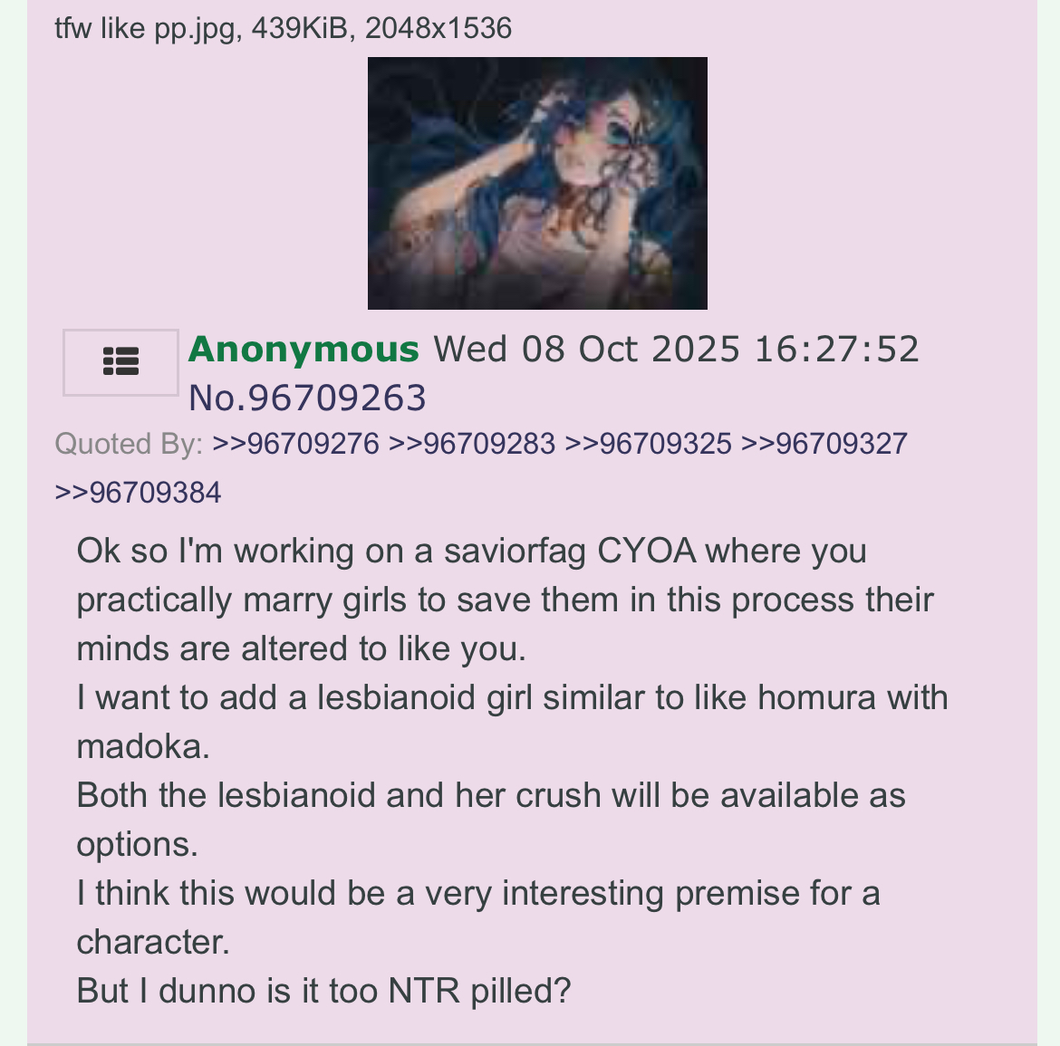 >>96838327>>96838372Is it really trolling when he made a CYOA people liked for once? If anything the only person he trolled is himself, by seeing how popular he could be if not for his hangups.