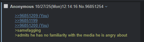 >>96851209>>96851199>>96851200>samefagging>admits he has no familiarity with the media he is angry about