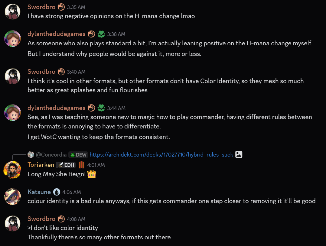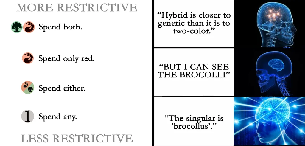 So much of this argument feels like people talking past one another, or using "colored" to refer to multiple separate things. Pic related is what the change will result in, whether or not you agree or disagree with the change, a card's mechanical colors vs color identity vs actual CMC/casting pips are three separate things already. The hybrid change is only impacting one of these three things. Pic related would be the state of how the game works post-change; whether you think that's good or bad is a matter of taste, but at least get on the same page when talking about it.