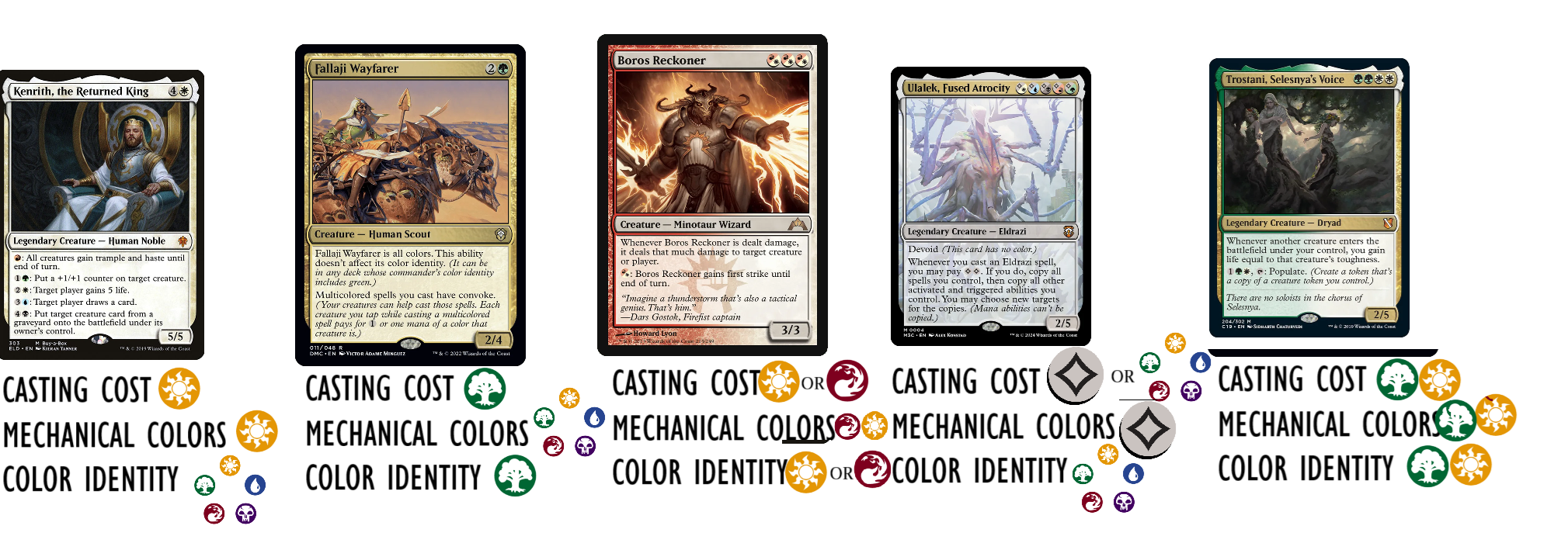 >>96856759>Does this make them multicolor?This is an appeal to the card's colors, not it's color identity. A card's mechanical colors has nothing to do with color identity. The most popular mono-white commanders are actual WUBRG slop five color color identity cards, for example. It also goes the other way around, too. Pic related has the COLOR IDENTITY of mono-green, despite being ALL FIVE COLORS mechanically. There's mono-color cards with WUBRG identity and WUBRG colored cards with mono-color identity. They're completely divorced mechanics. So every time people say "well, hybrid cards are multicolored!" the response is "Yeah, so?" because the question about Color Identity is separate from being mono/multicolored. Right now a GW multicolored card and G/W G/W card are treated identically for purposes of color identity, but there's no actual reason G/W G/W can't have "choose a color identity" the same way they have "choose a color to cast".