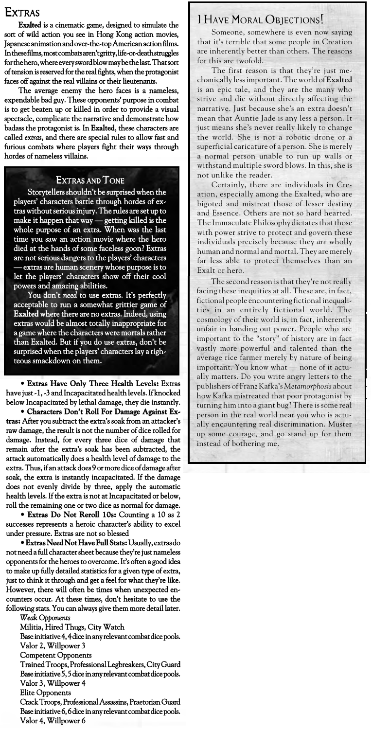 >>96856128>do different kinds of Exalted go together well in a group, or is it better to keep everyone as the same kind, like Solars?Depends on the Exalted. Celestials generally mix well, and Terrestrials (meaning characters about on par with Dragonblood like raksha too, not just the Terrestrial Exalted) generally mix well, but Exalted generally don't mix well between them. Solaroids can go well or poorly, it's a bit up in the air a lot of the time, and do okay with Celestials. The main thing is that a mixed game and a pure game tend to run very differently. A game that's pure Lunars has very different assumptions because of things as basic as everybody having a fast overland travel speed via flying animals, being capable of stealth, and so on. A Sidereal game is similar in that everybody has access to Resplendent Destinies and Heavenly Gates and that means a full circle of Sids can do things a mixed circle can't. Dragonblood games assume your party members aren't automatically the biggest deal around. A Solar or two ends up being common in mixed games because their base assumption is only that you are powerful and don't have strong ties to supernatural factions, and most mixed circles fall into a Solar-like pattern because that's doable for most Exalted, not just Solars.