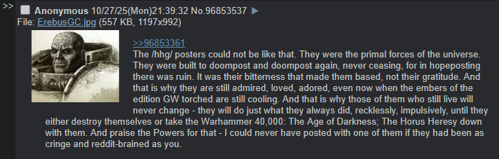 >The /hhg/ posters could not be like that. They were the primal forces of the universe. They were built to doompost and doompost again, never ceasing, for in hopeposting there was ruin. It was their bitterness that made them based, not their gratitude. And that is why they are still admired, loved, adored, even now when the embers of the edition GW torched are still cooling. And that is why those of them who still live will never change - they will do just what they always did, recklessly, impulsively, until they either destroy themselves or take the Warhammer 40,000: The Age of Darkness; The Horus Heresy down with them. And praise the Powers for that - I could never have posted with one of them if they had been as cringe and reddit-brained as you.What did Chris Wraight mean by this?