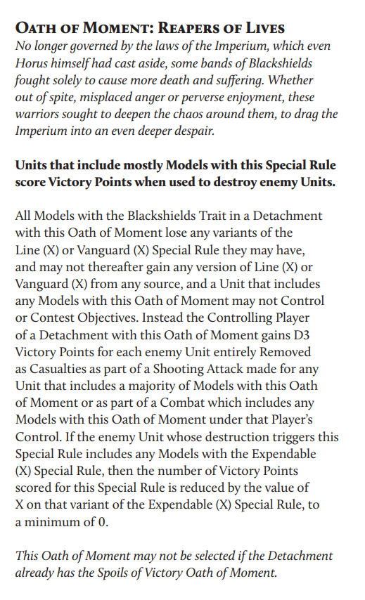 The problem with Dark Angels was that they clearly thought that the extra detachments were going to be such a game changer that they could have a very weak legion rule as a balance, and it turns out that while the detachments are kinda nice, I would use like half of them, they don't make up for just not having anything base. Its a wasted opportunity, because if they wanted Dark Angels to be all about bring the wing detachments, actually make them rewarding for it. What they SHOULD have done, was make the Hexagrammaton be the extra detatchments and keep the Dark Angel wing buffs, or at least give them special designed prime buffs or what not but tied them to specifically the units in their dedicated detachments and the hero that unlocked them, and make sure the player is still told to model their heroes to match their wing like before. So you still got +1 on your bolter shots, but only in stormwing detatchment, either for all squads in the stormwing detatchment or for the prime unit, it doesn't really matter to me. You still got the movement buff for ravenwing, but only on units in that detatchment, if you have a ravenwing hero unlock them. You would have to adapt some of the wing rules, they dont even need to be really that strong, just more rewarding then a bad leadership modifier that doesn't work correctly, instead we use our detatchments and just get 2-3 extra prime slots with the same prime rules as everything else. Even with them the only ones that really add value are the Deathwing and Ravenwing, because getting prime on those units is intersting. The only thing that I enjoy in the new Dark Angel rules is the exindo, which can now challenge which I find funny as fuck and is half the cost it was before. I guess Deathwing Companion terminators are bonkers with eternal warrior 1, but your just more boring Inner Circle, but if I bring Inner Circle they are so expensive for a unit without vanguard.