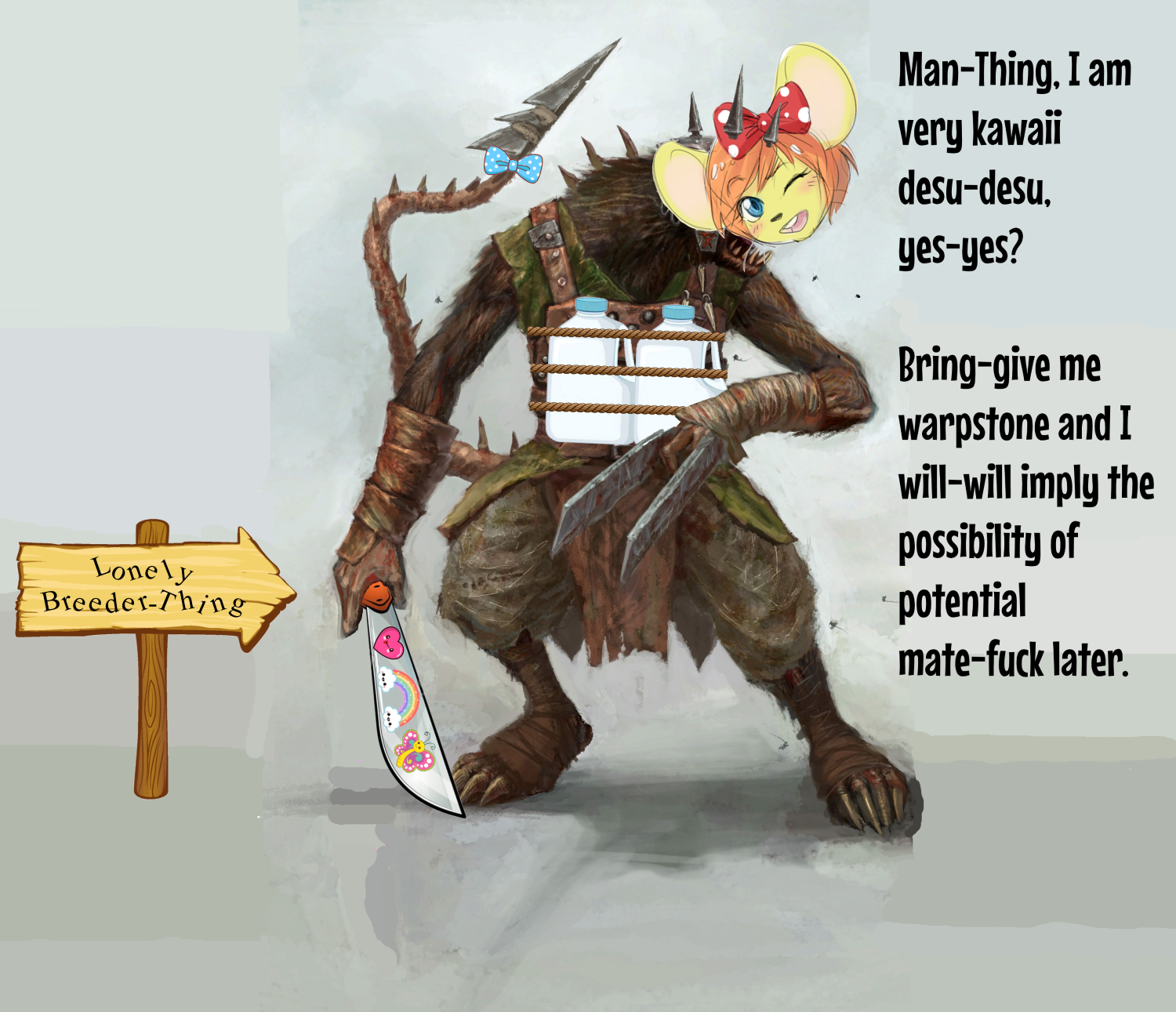 >>96859704They do have females, though, they're just drugged up and mutated to the point that they're not even conscious. The only exception are Thratquee's personal breeders, who he turned into rat-ogres because he likes his ladies giant and muscular.