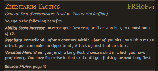 >>96890546Could you not just re-flavor this feat into something else? Tie it to a different faction relevant to the setting you're playing in? Or even just rename both into generic names?>Zhentarim Ruffian---> Ruffian>Zhentarim Tactics---> Ruffian TacticsNothing stops a character from getting an Origin Feat as an ASI or from Lessons of the First Ones. So technically you don't have to have a background as a Zhentarim to get access to it!