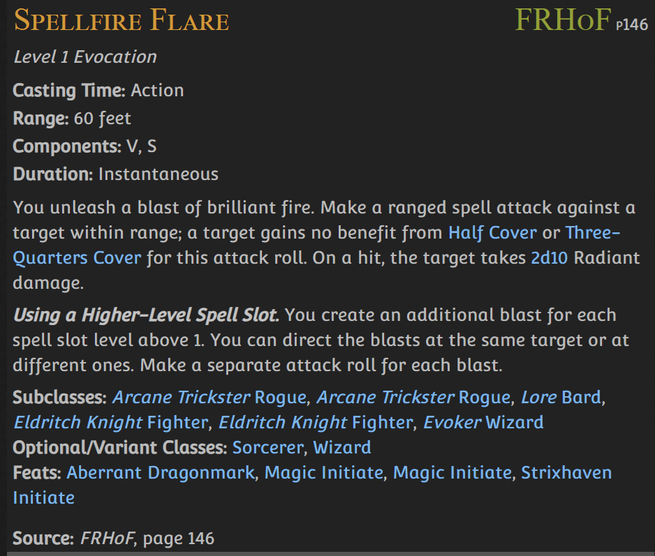 >>96890407You can't Eldritch Blast the moon, but you can Spellfire Flare the moon! This is basically Eldritch Blast, but it's a 1st-level+ spell, so it's kind of meh.