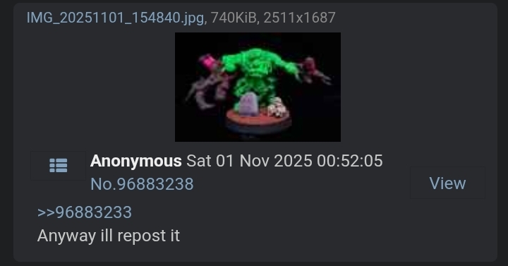 >>96883324Yeah so you can't really demand timestamps from people without posting your own, but theres nothing saying someone has to respond to your call for you to post models. I didn't see that but likely that anon posted some grey plastic or something nobody has ever seen before and expected people to identify themselves in response. You see it occasionally, like the bandaifag posting random ebay rescues or that faggot with the single unpainted servos skull and half painted chimera. You have to understand that to post your models mid argument is to invite drama into your life now and into the future, because unless clear up your disagreement in a totally friendly way, someone is walking away with bad vibes about you. That's what leads to people getting harassed for months. So while it is definitely fucking gay to not respond to timestamps, if someone isn't taking the same risk you are then it's not worth it