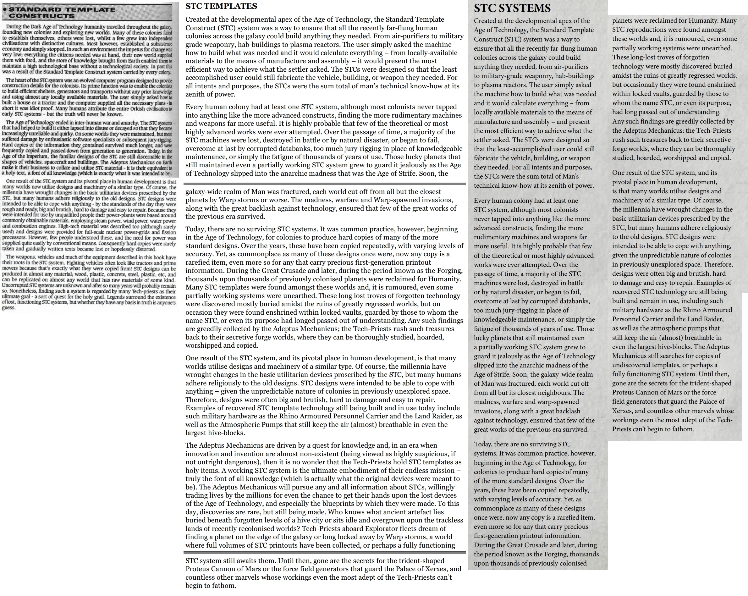 It's implied in the Necromunda lore books and Priests of Mars that the Imperium actually possesses several STCs, but they don't realize that they're STC. For instance, Archmagos Kotov discovered that every Arc Mechanicus ship ironically contained a complete and functional STC library, but the Admech had misidentified the STC module as a basic and unimportant cogitator. Unfortunately, he was mindwiped before he could tell anyone. Furthermore, the STC AI seem to actively be avoiding the Imperium. They'll work with non-Imperial humans, the Votann, and even xenos, but hide away their functions from the Imperium and chaos. Why is that?