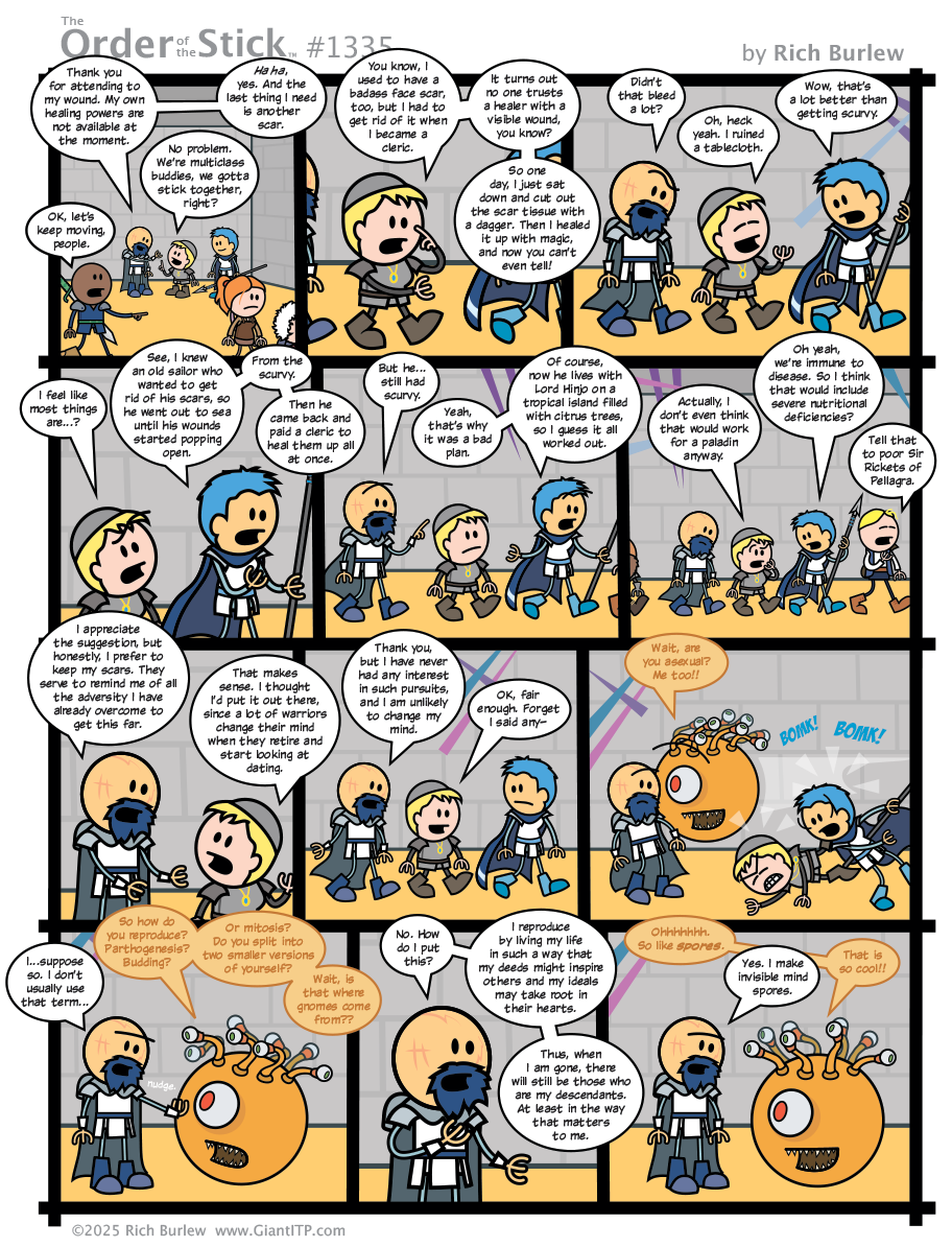 >>96892613It's a combination pandering and gag-a-day strip when he's nominally making a serious effort to finish sometime in the next decade, and the last one was a tik-tok gag-a-day strip. What with aura-farming months ago and that scurvy opening scars has absolutely been doing the rounds online I wonder if he's just sitting in front of tumblr because he's run out of ideas. The bit that anyone who got scars before gaining access to healing spells has to do surgery to be taken seriously was moderately interesting, but the sex stuff coming from what's ostensibly a child and been largely treated like one is a bit bleak, although I guess given Elan's apparent mental age that's not something Burlew thinks or cares about
