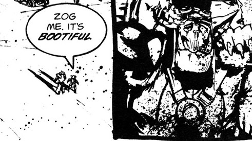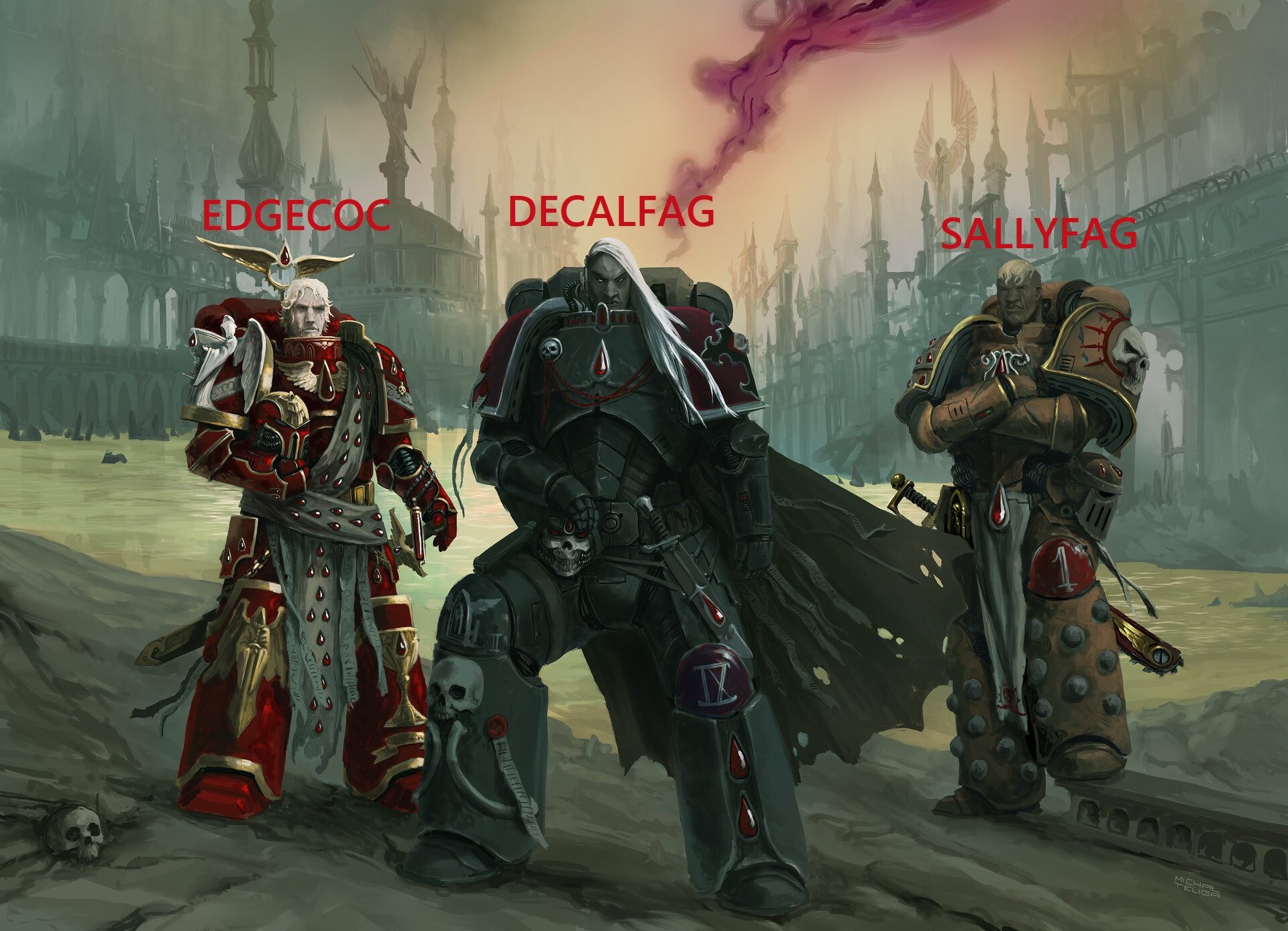 Mike Brooks - The mixed-race, transgender custode unleashed Xyr bolter into the horde of Necrons, smashing the enemy with a stunning and brave display of their truth.Dan Abnett - The olive-skinned woman in the tight black bodyglove used her mary sue powers to kill another 300 chaos space marines. Arron Demski Bowden - "You are the real monsters, loyalist scum," screamed Zorracar the Baby Eater and Puppy Molester, 1st Talon of the Edgelord Claw of The Night Lord pirate warband.